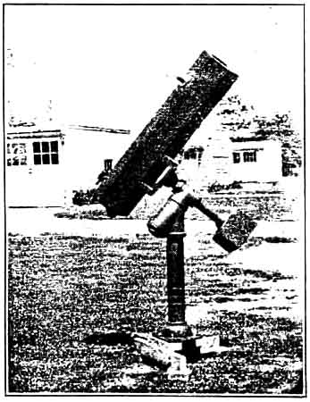 "The enclosed photograph," Mr. Towson writes, "shows a mounting which I believe is as simple an affair as it is possible to assemble, requiring machine work only for four bushings and the two axes. The base pillar and 45-degree 'Y' branch are now permanently mounted on a concrete foundation. The rest of the mounting is temporary and will be replaced by a Ford axle rigging. "The six-inch mirror, being my first attempt, has many faults; it is scratched, the parabola is questionable, and the silver does not reach the edge, but it is good enough to separate the components of Epsilorn Lyrae and therefore serves to prevent undue haste while I polish an eight-inch mirror for the same mounting." One of the most elaborate telescopes thus far made from the instructions contained in "Amateur Telescope Making," is the product of J. A. Johnson, Opt. D., 322 Patterson Building, Fresno, California. The description, sent in by the maker, runs as follows: "I am enclosing some pictures of a 10-inch telescope which I have just completed. It is equipped with a clock and setting wheels, with lights over the circles to read at night. I made patterns and had all the parts cast. The tube is 12-inches in diameter and six feet, six inches long. The mirror is 72-inch focus. "The gears of the clock are standard stock. After making four different governors, I finally got one that is sensitive enough and it works perfectly. It took me 1800 hours to make it. I worked every night from 7 P.M. until 11 P.M. Telescope making is some hobby. "The telescope house is 8 by 8 feet and 8 feet high to the plate. The telescope rests on a concrete base with a concrete floor nine feet square. The house is mounted on four small flange wheels which run on a light iron rail track. "Your book on telescope making was a big help." Some months ago we stated that a club of amateur telescope makers was being organized in Chicago. Thus far, however, no very tangible results have been reported from Chicago, but Philadelphia has now beaten Chicago to it. The following letter from Glenden J. Dunlap reaches us on the letter head of the local Y.M.C.A.: "A club has recently been organized at the Central Y.M.C.A., for the purpose of giving instruction in the making of telescopes and in astronomy. The man in charge is Mr. G. H. Lutz, a civil engineer who made the world's first permanent telescope mirror (stellite) which is now on exhibition in the American Museum of Natural History, New York. "The organization is called 'The "Y" Telescope Club' and meets at 7:30 every Thursday evening, in Room 121, 1421 Arch Street. It is open to young men of high school age and over. A list of those in Philadelphia who have evinced an interest in amateur work of this kind by purchasing copies of "Amateur Telescope Making" is being sent the club. Finally, may we recite a joke, taken from the Wright Engine Builder, a house organ? It seems that two darkies who were discussing the relative merits of the sun and the moon said: "De sun am de bes'; dey cain't be no doubt about dat," said Sam. "Look at how much mot light she give dan de moon. You ain't tryin'to convince me dat de daylight ain't brighter dan de moonlight, is you?" "Dat's all right about de sun givin' de mos' light," replied Joe, "but you is got to remember dat de moon deserves de mos' credit because de light she gives some at night when it would oderwise be dark, while de sun shine in the day time when it am light anyhow."