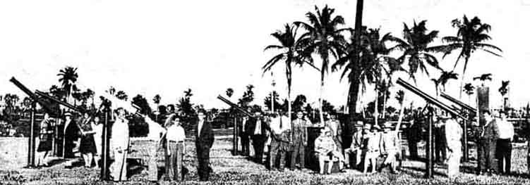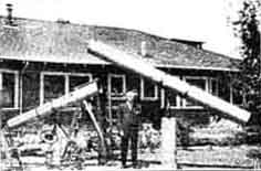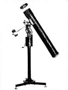 "Some nights 3000 or more people at tend, and they are given opportunity to view some celestial objects and hear various educational talks. The average this winter is 1500 per night, the observatory closing at 10 P.M. Early morning observing is done two mornings per week, and attended by only a few of the faithful." Leslie Long, of Cornelius, Oregon, describes a rather unusual telescope as follows-"The mount, which was made b Jesse Watson, is of the equatorial type wit hollow declination axis, with the eyepiece in a fixed position on the end of the polar axis. All the parts were machined out of stock material, with the exception of a two and one half inch pipe "T", a phonograph motor and a Ford front spindle which is used for the polar axis. The spindle is rotated by gears, through a friction clutch built into the brake drum. The clutch allows motions of the spindle without the gears, if desired. The "T" was-dressed up in a lathe and a steel bearing for the declination bearing was fitted in the side opening. In the remaining opening a steel fitting was placed, which holds the eyepiece tube and focusing arrangement as well as one of the prisms, this being three quarter inch size. "A one and one-half-inch prism is mounted inside the tube, both prisms being in line with the declination axis and bringing the light from the mirror to the eyepiece with any position of the telescope. The tube is balanced on the declination axis by a lead weight, and about the polar axis by another weight. "The phonograph motor is mounted inside the steel stand. The polar angle may be adjusted, without interfering with the gear train. "The six-inch mirror was ground and finished by me, under difficult circumstances. No basement was available and the work was done in the open air, with the final shadow tests made in an ordinary living room. Temperature troubles were great, but the mirror was brought to a perfect paraboloid and shows very good definition at high powers. The telescope is at Pacific University for student use." It is interesting to note the wide variety of vocations represented by our list o amateur telescope makers. The description quoted below comes from a physician, Dr. J. J. Byl of 430 South 13th Street San Jose, California. Obviously, Dr. By is a real enthusiast, else he would not have made two such businesslike telescopes as those shown in the illustration. "In sending you pictures and a brief description of my telescopes," says Dr. t; Byl, "I believe I have no other motive than to be helpful in stimulating an interest in a useful and noble activity for young and old. In including myself in one of those I have done so only on your command. [Yes, we prefer this.-Ed.] "I am a retired physician well along in years but have great anticipations of joy in so profound a study as the boundless Universe, and I am sure that my day will never be shortened by a loss of activity or interest in life. " My ten-inch telescope has done good service for some time, although the silvering has not been by far what it might be. I have not had good success with the Lundin process. After three failures with the 12-1/2 inch speculum, I followed Brashear's method and was surprised with my easy success. "The tube of the larger instrument is 13 inches by 12 feet and the focus of the :speculum is 12 feet, 4-1/2 inches. The material is 16-gage galvanized iron with the edges all butted and soldered and the joints reinforced with bands of the same material. The mountings of the smaller one are of shaped steel and pipe; and of the larger one, castings from my own patterns The shafts are cold-rolled steel selected to fit exactly the inner faces of the Timken ball bearings at both ends of all shafts. "I wish to call special attention to the compact and strong cradle of steel plate for the tubes, and the pedestal on a base of rejected kitchen tanks which can be had for little or nothing. "The smaller instrument can be driven by clockwork. The larger one will have an electric motor drive in which the speed is reduced by three worms and a small pinion on a ring gear, shrunk on a brake drum. The latter serves as a circle also. "The 2-by-32 inch finder is now made and mounted. "Invention and machines have since my boyhood been as natural as eating. I do all the work myself and with pleasure, consequently, the cost in money is not great." So writes Dr. Byl.-The Tel. Ed.