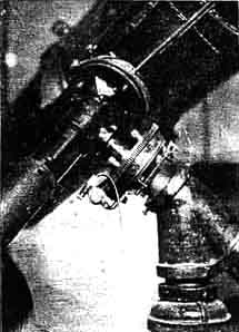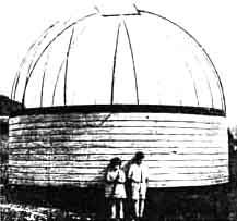 "The observatory," he states, "is 16 feet in diameter. Its side walls are 48 inches high. For a foundation we put down four six by six-inch chestnut posts, below the frost line. Next the post for the telescope was put in. This is a six-inch, steel well casing, set about six feet into concrete, and off center enough to allow for the overhang of the polar axis. The floor of the observatory was then built up on two-by-sixes, with the flooring laid diagonally for rigidity. Clearance was allowed around the post, to obviate vibration. "On a 16-foot circle two-by-fours were placed at two foot intervals. These were braced plumb, and on them on the inside was put a two-inch angle iron with the leg down. Through this a lag screw was driven into each post, making the whole very rigid. All angles throughout the whole job were rolled on an eight-foot radius. This simplifies things a great deal. "We then sided the structure with regular six-inch weather boarding, which had the lower inside edge rabbited out so that the siding would fit the strip beneath and prevent the ends from pulling up when laid on a circle. This is one theory which distinguished itself by coming up to expectations. "For the lower track we used a two-inch angle iron with leg turned up on the outside, screwed to the top of the uprights and screws countersunk to give a smooth track. The upper track is a one and one half inch angle iron, with a three quarter inch angle spot-welded to its under, inner edge, to make a race for the balls. "Steel balls apparently are very expensive, even if 'seconds' are used, so we had the balls turned out of maple and then soaked them in linseed oil for a few days. All were heavily coated with grease and then put into place. Between the balls are sticks of wood about two feet long, cut as segments of a 16-foot circle, to act as spacers. "For the dome, we made the opening of one and one half inch angle iron, with a flat top. The lower end is bolted into the upper track. The material used was just light enough so that we could punch out the holes with a large hand punch. After the frame of the opening was in place we bolted in the ribs, which are three quarter inch angle iron, leg side down. The upper or flat side of the angle was then punched in three or four places and slats of wood screwed on it. To these slats the canvas covering was tacked. "In putting on the canvas, we started at the opening, which has a lateral brace at the bottom, and stretched the canvas over the adjoining rib, holding the rib in place by putting a couple of sticks between it and the opening; and so on, around, until we reached the other side of the opening. The wooden braces were then knocked out and the dome held its shape. This makes a remarkably rigid dome, and not too heavy for one person to handle. The canvas was painted at once with about 50 pounds of white lead and four gallons of linseed oil. On the first painting the canvas takes up all the oil it will hold. This makes it a perfectly watertight, neat, light dome. "Along the sides of the irons forming the opening, we bolted on a wooden coaming about three inches high, and then made a strip of canvas four inches wider than the opening, sewing a flexible wire into the sides of the canvas, and a heavy roller across the bottom. There is also an occasional light wooden strip tacked across its width, to act as a spreader and to help bear the weight of snow and ice in the winter. Then, with a rigging very similar to what is used on a roller awning, we roll up the canvas out of the way at the top of the dome; and when finished, roll it down very quickly, stretching it tight so that the sides of the canvas come down over the coaming, making it storm proof. "The telescope itself has a 16-1/2 inch mirror of 125-1/2 inches focal length. The tube is of 16-gage steel, allowing a three quarter inch air space along the sides. The cell is of the conventional type. The finder is a two and five eighth inch doublet, 16-inch e.f.l., with cross hairs in the field. "For the axes, Ford axles were used. The housing at the brake end was machined off, and a 194-tooth gear bolted into this, and against the gear rests a slip plate which acts as a clutch. Through this plate run three heavy adjusting studs over springs for regulating the pressure of the plate on the gear, and thus the amount of drag or slip between the ring and the axle. In this way, we swing easily to any position, and at once pick it up in slow motion. As the tube and fittings weigh several hundred pounds it is necessary to have this very accurately fitted for use with high powers. "The declination axis has a rod running from the gear to an easy position at the eyepiece. The declination lock is another rod, parallel to the first, running through the brake-band housing and screwing against the part which was formerly covered by the brake lining. "The polar axis has the same gear and plate movement, but the drive goes through another 12-to-1 worm and gear, giving reduction of about 4000-to-1. This makes the drive very steady and powerful. This gear is driven through a speedometer cable, on the end of which is a handle similar to a file handle, with the cable run through it lengthwise and having a small crank. With this arrangement, the drive can be used by the observer; or, once the tube is set in declination, the object may be held in the field by some one other than the observer, who makes a turn of the handle once in 23 seconds. Next to having a driving clock, this is very satisfactory when one's friends wish to look, as the only necessary admonition is to keep hands off the telescope. "The eyepiece is the regular rack and pinion type. We use negative oculars down to one fourth inch. This size gives a magnification of 500 diameters with this mirror. We are having 750x and 1000x made, but 500x is as high as we can generally use, and then only on very good nights. "We expect to build a clock drive, although the flexible cable idea i