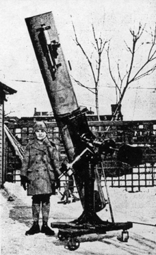 "After setting the whole thing up, I found that my arm was about three feet too short to reach the slow motion in right ascension. By means of an old golf stick and a home made spring of steel wire which just fitted over the projecting end of the slow-motion spindle sufficiently tight to take hold, and with the end of the spring turned up at right angles like a finger to engage in the spokes of the little hand wheel, I was able to rig up a very effective means of working the slow motion while standing on a ladder at the eyepiece. This will work at 90 degrees where a universal joint would not. "The clamps in declination and R.A. are metal-to-metal friction bands turned in the lathe and are adjusted by a small screw, allowing the telescope to move easily without binding and yet they hold it in place when necessary. "I enclose a local newspaper's idea of a description of a telescope; life has scarcely been worth living since this appeared. However, I am bearing up bravely." FROM time to time we have received certain premonitions that Mrs. Margaret L. Wiesenberg, of Christian Witness to Israel, Inc., 521 West 179th Street, New York, was making a telescope. And now we can prove it: Mrs. Wiesenberg, at our special request, sends us a photograph of telescope and maker. We can bear witness that she has a good grasp of the work, both practical and theoretical. The parts of the telescope we have seen look as shiny as a new dollar, and the whole job looks fit, and is fit, to use in regular astronomical work.
