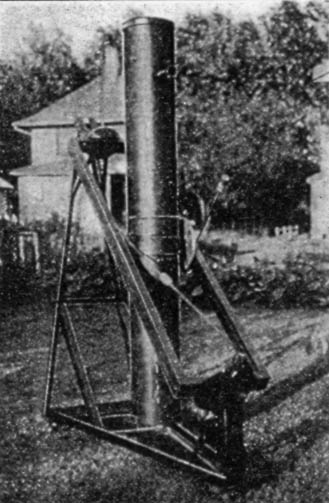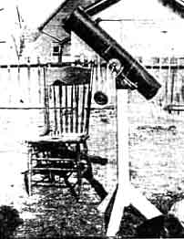 THE telescope shown below right is a four incher, made by Arthur D Flagg, from easily obtained materials, the mirror disk being a piece of broken windshield from a motor car. Mr. Flagg used part of an old Ford water pump for his polar axis support. He also used the brass shells of discarded light sockets for making three eyepieces. A magnification of 40 or more diameters may be had from such a telescope. P. M. JONES, 3421 Second Street, Des Moines, Iowa, whose second telescope is illustrated opposite, used the H C F lap and "found it all that was claimed for it, both in its rapid cutting and the east of changing the tool to alter the figure." The framework of his mounting is of steel angles. This is very rigid. The yoke is made of three-inch channels welded at the joints. The telescope has a friction drive on both axes, consisting of a 10-inh disk edged to fit a small V-shaped roller held against it by a spring. Setting circles were made of lacquered protractors costing 20 cents each. WE now continue and conclude below Professor Douglass' informative discussion of "Atmosphere, Telescope and Observer," begun in the last number: "It is easily a matter of observation that making allowance for the variation in brilliancy of the apparent field when the eye is in the focus, the atmospheric currents are precisely the same in telescopes of different apertures at the same time and place. This is of course what should be expected. But different apertures do change the character of the seeing and this also is what we expect. Conceiving the waves to consist of crests and valleys as the waves on water, we see that the refraction takes place on the slopes between these and that two adjacent slopes refract in opposite directions. If we take the distance from crest to crest as d and the mean amount of refraction in each slope as r seconds of arc we shall find that in a telescope with an aperture of 1/2 d or less the image in the focus will oscillate through a distance of 2 r. If the aperture of the telescope is d we would see in succession, if the waves were all of perfect form, first a haziness of the planet, then a displacement of r seconds in one direction, then a haziness followed by a displacement of r seconds on the other side of its original position, then a haziness as at first, and so on; the haziness in each case being due to the presence of two slopes at once before the lens. If the aperture were 1-1/2 d there would be alternations of haziness with these displacements of r seconds, the displacements themselves being not entirely free from haziness. With further increase of the size of the objective, displacements would for a time exist but become more and more hazy until at last they would cease, leaving the planet perfectly steady but blurred.