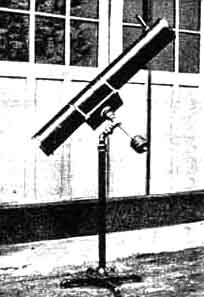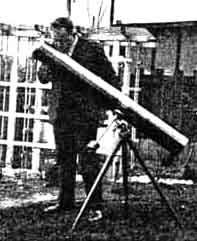 "Having completed the concave mirror in good shape it did not take long to mount it temporarily and, after a few crude attempts at seeing the moon, using a small looking glass for the diagonal, I commenced to believe that the job was worth finishing. So I made a prism of ordinary plate glass to replace the rough diagonal mirror, bringing each face of this prism flat to within a wavelength of light. Two eyepieces were made from lenses secured from a local camera repair man and these when used with the telescope gave magnifications, respectively, of 80 and 130 diameters. "The mounting I finally made is admittedly a bit light but is satisfactory when there is no breeze to shake the telescope. It has 3-1/2 inch dividing circles which were indexed from a 72-tooth gearwheel. This gives me a fairly accurate line for every five degrees of declination and every 20 minutes of time in right ascension. The finder is an eight-inch length of half-inch tubing with the eye end stopped down to an eighth of an inch. No lenses are needed and it works well enough. "How much did the telescope cost? Well, all my spare time for six weeks, some gibes from my family (previous to completion; afterwards quite the reverse) and the exercise. The moon provides an interesting sight. So also do Jupiter with his four visible satellites, Venus, a number of double and other interesting types of stars and a myriad of stars where to the naked eye there is blank nothing." Mr. Groh requests the Telescope Editor to comment on the glass he used, that is, common plate glass. This is the kind used by all amateurs (and by professionals, too) on sizes up to 12 inches in diameter. Expensive optical glass would not serve the purpose better. For a six-inch mirror the glass disks should be three fourths of an inch thick. These disks may sometimes be secured locally, but they can be obtained from a special dealer, all put up in ready-to-begin-work form, with the correct kind of pitch and abrasives, for about ten dollars. Other parts, required several weeks later after the essential concave mirror is complete, may run the cost up to about twenty-five dollars, but the finished product should perform on a par with a 300-dollar instrument. A six-inch reflector equals a four-inch refractor in general performance. F. L. SCARBOROUGH, 2105 Fourteenth Avenue North, Birmingham, Alabama, has made one of the telescopes of the type described by John M. Pierce, in "Amateur Telescope Making." Mr. Scarborough. writes, "This simplified design was followed closely because the writer's knowledge of mountings, upon beginning the job, was negligible. There was only slight difficulty in any part of the work. My first attempt to make a polishing lap was a failure, but on reference to 'Amateur Telescope Making' it was decided that the a pitch of which the lap was made was too hard, so it was tempered slightly with turpentine and a softer lap prepared from it. Polishing with this lap was uneventful and the job was soon finished. (In the average case this takes about six hours-Ed.) "Silvering by the Brashear process, as per instructions, was successful upon the first attempt. The directions for silvering were followed explicitly, using every precaution against contamination of the solutions. "The results obtainable with this simple instrument are surprisingly good, amply repaying the slight expense, in this case about fifteen dollars which included the ready-prepared mirror outfit. The topography of the moon is strikingly clear and the effects due to changes in its phases are a wonderful sight. The planets are a delight. One view of Saturn with his rings and satellites, is generous compensation for the production of a telescope of this kind. These sights, together with others too numerous to mention, inspire one to a systematic study of science." Mr. Scarborough's experience is typical of many others. It is perhaps difficult to believe that a raw beginner, with no more skill than is implied by the ability to do various handy jobs and with the possession of a little patience, can make an astronomical telescope that is more than a mere toy. But a six-inch mirror-the size best suited for the beginner-will magnify 100 diameters, and even at the large observatories it is seldom that more than 400 diameters magnification is used in studying planetary detail. That much magnification can be had with a 12-inch mirror which the amateur should be able to make after making first a six-inch mirror and preferably another intermediate size. Usually the beginner inclines in advance to regard the job of making the mirror as a task, but soon finds it is a real pleasure and wants to do more of it, so he makes a second and larger telescope; some have made several. THE letterhead of Thomas F. Scanlon, 1405 East Street, N. S. Pittsburgh, Pennsylvania, gives evidence that he is a plumbing and heating contractor, but in his letter he says "I am a plumber, and I admit it. " Mr. Scanlon's telescope is mounted almost entirely with various pipe fittings and plumber's accessories. This, of course, has been done before, though not so thoroughly, and this method has amply made good. These fittings are inexpensive and readily obtainable anywhere. The yoke that holds Mr. Scanlon's telescope tube was stated to be part of an old toilet tank and the retaining bands came from an old bricklayer's level. Their ends consist of brass sink bolts soldered on. "The tube," writes Mr. Scanlon, "was made of 22-gage galvanized iron and cost one dollar fifty-six. The mirror is a six-inch and was completed during the evenings of two weeks. The eyepiece socket is part of an old wash-stand drain and some pieces of lead sink waste pipe, while the extension was made of nickeled tubing from an old wash-stand trap. "The cell is a seven-inch perforated brass ring, a stock item in our business, having a raised seat on which the mirror rests. Three brass sink bolts were soldered radially to the circumference. These bolt