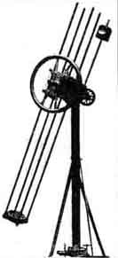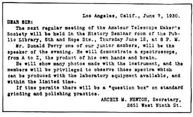 Last year so many attended this informal confab of amateur telescope makers and astronomers that it was a question whether to rent a circus tent next time. People came from all over the east, and some from greater distances, to commune with other enthusiastic telescope fans. There is a small hotel in Springfield, also very limited "quarters" (for men) at "Stellafane." A good many come in their cars, bringing the families and tents. There is all sorts of room to camp, and a good spring of water is nearby. Leave your dress suits in mothballs, as this is not a "high hat" affair but just a friendly, comfortable gathering of "folks." If you have made a telescope or invented any kind of optical dingbat of which you are unashamed, bring it along and give the other fans a chance to knock it. If you wish to make any special arrangements write to the Secretary of the "Telescope Makers of Springfield," Oscar S. Marshall, 135 Wall Street, Springfield, Vermont. WHEN the hot months come people usually let up their efforts in telescope making; they had rather be out of doors than working in the cellar workshop. About September the orders for the instruction book "Amateur Telescope Making" always begin to come in thick and fast, and then we know the game is on again. However, to judge from the postcard announcement which is reproduced on this page, telescope making activities never wane, even in hot weather, in lively Los Angeles. Fragments of information reach us from time to time about the various activities of the Amateur Telescope Maker's Society of Los Angeles, the latest being that they have gone in heavily for refractor making. The seed that was dropped in that city -four years ago is growing-in fact, already has grown-into a thriving tree. We wish the amateurs of "L. A." would send in accounts of their doings, with photographs of the jobs done, for publication. . Some of the telescopes made by amateurs have been pretty elaborate affairs and some are not so elaborate; However, we publish them all because we do not wish merely to feature the finer ones. A worker who builds a small instrument may lack facilities for making a large one, he may not happen to have had special training in machine work, he may not be rolling in wealth, but he derives as much fun from making it as the fellow who puts together a big one. One thing, however, is that we have found that the work is not suited to boys. Very few have made good at it, ant those, we suspect, were unusually bright lads with an aptitude for mechanical work and for thinking. JUST how inexpensively a telescope be made never has been settled, but Bob Burns, of 326 Courtland N. E. Atlanta, Georgia, has shaved a big chunk off the average cost of a six-inch reflector. The materials for a six-inch telescope which will magnify from 50 to 200 diameters usually cost about 25 dollars. The initial outlay is ten dollars for a prepared package: containing the glass disks, abrasives, an pitch. With these the mirror is made and then after some time the eyepiece an diagonal prism, each at six dollars, are obtained. The average amateur worker can be trusted to pick up the remaining parts, chiefly secondhand, for little no more than the remaining three dollars. Often we are asked whether there is a way to ma a telescope still more cheaply than this. There is. If one can pick up microscope eyepiece t will save six dollars. Other savings are possible some cases, depending o the worker's resourcefulness. A four-inch, instead of six-inch mirror, provided the main solution of a cost problem, in the ease of Mr. Burns, who made a telescope at a total cost of $5.36. We asked Mr. Burns to tell the amateurs how he did it. Here is what he reports. The four-inch glass disks were cut from two pieces of one quarter inch broken windshield glass which I procured for the asking at an auto junk dealer. Cost . . . . . . . . . . . . . . . $ .00 Cutting and grinding the edges of these disks, at an automobile glass service station, was . . . . . . . . . . . . . . . . .25 The American Optical Company furnished me three grades of emery (No. 60, 120, 302) and the rouge for . . . . . . . . . . . . . . . . . . . . . . . . . .65 Silver nitrate, one quarter ounce, cost . . . . . . . . . . . . . . . . . . . . . . . . . . . . . .25 I used household ammonia and formaldehyde to reduce the silver nitrate when silvering the mirror. Cost to me . . . . . . . . . . . . . . . . . . . . . . . . .00 A wood turning shop made the wooden mirror cell for . . . . . . . . . . . . . . . . . . .50 The 24-inch tube is made of polished sheet zinc, and cost . . . . . . . . . . . . . . . . . .90 For my diagonal I used a piece of one quarter inch plate glass of oblong shape, 1 1/4 by 3/4 inches, corners rounded, the supports being soldered to the inside of the tube. The cost of this was . . . . . . . . 00 The eyepiece was taken from a "pencil" microscope which cost . . . . . . . . . . 1.00 Brass tubes for eyepiece (plumber's shop) . . . . . . . . . . . . . . . . . . . . . . . . . . .15 Lumber for tripod, cut to size . . . . . . . 1.25 Bolts for tripod . . . . . . . . . . . . . . . . . . . .20 Lacquer and brush for painting tripod and inside of tube . . . . . . . . . . . . . . .20 The total expenditure came to . . . . . . . . $5.35 I polished my mirror by gluing the crown of an old felt hat to my tool and polishing on this pad. It finished out in about 1 1/2 hours. I made no attempt to change the curve from a sphere to a parabola. With the three quarter inch, double-convex eye lens the telescope gives about 50 to 60 diameters magnification. The innumerable craters on the moon are very interesting. PHIL E. CHURCH, 104 East LaRue, Streator, Illinois, sends in a few pictures of an unusual telescope. He says: "Three of us did the work, but 'Friday' Angier conceived and built the mounting. The steering wheel is for rapid control in directing the telescope but there are slow-motion screws and these are turned by means of sewi