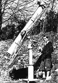 Thus does A. B. Stephens open a letter written from Negya, Chauk, Burma, where he has been drilling oil wells. He continues: "The glass is of six-inch aperture and was furnished by John Pierce of Vermont, along with the prism and eyepiece. Grinding and polishing the glass required several months, working a few minutes each day, and the figuring took another long period of time as I overshot the mark while parabolizing it and got a nice deep hole in its center. After the hole was finally removed, a comparatively short time was necessary to bring the surface to a good figure. My greatest trouble was in finding a lap to stand up in this warm climate but finally one made of tar and rosin served very well. The silvering was a complete success the first time. "Let all those who are eager to make mirrors but do not have the ideal conditions as set forth by Ellison, take heart for, as one of the photographs shows, all of the grinding and polishing of this little mirror was done on the veranda of my bungalow, with, of course, all of the shutters closed. While the glass, no doubt, falls far short of the standard of Ellison and Porter, yet it gives a wonderful view of the heavenly bodies. Not only are the rings of Saturn sharply defined but also several of its moons; two in particular, perhaps Hyperion and Titan, with momentary pinpoint flashes of two of the closer moons. "I leave here shortly and thereafter my address will be 816 East Mayne Street, Bellflower, California." ALL over the world, in the most out~of~the~way places, in homes, on library tables and in the reading rooms of clubs you will find the SCIENTIFIC AMERlCAN. Here is a letter which reached us from New Zealand, written by Robert Bruce of 33 Vincent Street, Auckland: "I have read with interest of the many ingenious astronomical telescopes made by amateurs. The humble efforts of a grocer might interest your readers. I enclose a photograph of my three-inch home-made refracting telescope. Having a 31/2-inch Drummand lathe I may have an advantage over some amateurs. The telescope and equatorial mountings are in brass and gun-metal throughout, except the declination axis, telescope cradle, and R. A. axis, which are of mild steel. As the photograph shows, the polar axis is adjustable to all latitudes. There are slow motions in R. A. and declination. The R. A. circle is divided into 11/12-degree divisions and declination circle likewise. The R. A. circle is a rebated ring which for adjustment rotates on a central rebated disk which is firmly clamped to the polar axis. The circle is read by one fixed vernier and one movable one. "To adjust telescope to R. A. of star, first place it in the meridian position, rotate R. A. ring till desired R. A. is read off fixed vernier, then clamp ring to disk and move telescope till correct sidereal time is read by the same vernier, and there you are. Then, while the star is still in the field, put movable vernier to correct time by your watch and clamp it. For the rest of the evening, to find other stars turn telescope to meridian, adjust circle as before to desired R. A. at fixed vernier, consult watch and set telescope to read correct time of your watch from movable vernier. Thus you will be able to find your star without again calculating sidereal time." A SIMILAR idea has been submitted by A. V. Goddard, 282 Northeast 49 Street, Portland, Oregon, whose 16-inch reflector was described in our number of last January. Though original with these workers the idea is not a new one, but is a good one, nevertheless. Here is how Goddard describes it: "I have worked out a simple plan for using circles without the use of an expensive sidereal clock for calculations. Large observatories have used a system of three circles for calculating right ascension for years, but it is necessary to use a sidereal clock. "You will note on the enclosed drawing three elements, A, B and C. A is a pointer fixed to the tube of a telescope. This moves on the hour circle when the telescope b moved. B is the hour circle but is movable on the polar axis, and may be locked by means of a thumb-screw. C is an ordinary vernier with zero point, fastened permanently to the mounting of the telescope. This is all the equipment necessary, except for an ordinary cheap alarm clock or a watch that will keep fair time for few hours and can easily be set. "Here is the procedure: Look for any first magnitude star or object with a known right ascension. One near the zenith is best as this avoids refraction. Take Regulus, for example, at R. A. 10 h 4 m. Loosen the thumb-screw on the hour circle B, and revolve the circle on the polar axis until the pointer A indicates 10 h 4 m. Now lock the circle with thumb-screw. Line up the crosshairs in your finder exactly on Regulus and set your clock for the exact time indicated on your vernier C and hour circle B. The clock will now take of all difference in time for the remainder of the night. Now that the clock is set, it is a simple matter to find anything you like. "This may sound complicated but if once tried you will be surprised at the simplicity The drawing indicates 8 o'clock as shown on your clock. The pointer A may be placed in any convenient position relative to the tube, as long as the R. A. circle B can be revolved under it. I have used this system for a long time and find it very satisfatory. HERR SASCHA CHAGUN sends us the following note from Schwäb Hall, Schuppach Str. 1, Canstatt, Germany: "I enclose a photograph of my telescope, which in part was made according to your book 'Amateur Telescope Making.' The mirror has a diameter of 24 centimeters and a focal length of 2.2 meters. It was polished on a paper lap, using tripoli. In as much as this method of polishing is simpler and safer than the wet process (the polish is never as perfect which, however, does not decrease the optical efficiency) I am surprised that you did not mention this method in your book. Maybe you will consider it in a later