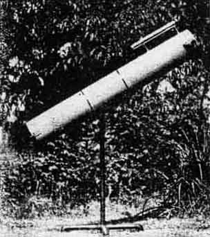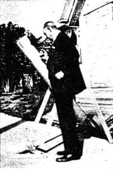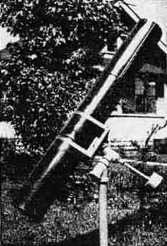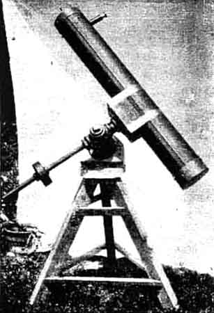 The one above left, made by Warren A. Donaldson, 3235 Gaylord Avenue, Pittsburgh, has a six inch-mirror. "When the polishing was complete," writes Mr. Donaldson, "I had the most unearthly figure imaginable." Much work reduced this to what a Pittsburgh professional telescope maker called "the best amateur job he had ever seen." The instrument has exceptional definition, and easily separates the double-double star in Lyra. The telescope above center made by William E. Mueller of Sutter, California, who says he commenced work all confident and expecting the job to be completed in a week or so. It took three months. The grinding consumed 12 hours, the polishing 25, and the figuring five. Eight laps were made. "Figuring was difficult, as per guarantee in 'Amateur Telescope Making,"' Mr. Mueller writes. "The cost was around 40 dollars. The rings of Saturn and any number of things seen. The effort was fully repaid" Next, above right is a job by Walter W. Gaulka, 4203 Waverly Avenue, Detroit, who writes: "I had occasion to compare my instrument with a Zeiss four-inch refractor. In definition mine was on a par with it. At 92 diameters Jupiter's bands are very distinct." This worker used a flat for a diagonal and mounted it adjustably on a rack and pinion. The mounting was extemporized largely from old Hupmobile parts. Below above left is a six-inch reflector by Taylor Bethel of Southold, New York, who says 'grinding and mounting a telescope mirror is the most intensely interesting work I have ever attempted. All work went smoothly until the silvering. I made three trials before I succeeded at that." Rupert H. Olson, 3629 25th Avenue, Minneapolis, whose telescope is shown next to the right, writes briefly: "I ground several four-inch glasses from the five-and ten store to get a little experience, so the eight-inch mirror was a small job to complete, by following the instructions in your book." Mr. Olson's method of preliminary practice is commended. That kind of approach to the job will pay in the long run. H. B. Donahay, of Blake, Moffitt and Towne, paper dealers, Portland, Oregon, sends in a snapshot of his six-inch, and says: "| cannot agree with those who say that making a reflector is tedious. I enjoyed every hour of the work from grinding the mirror to assembling the optical train." "The mirror proved to be a peach,"' says Oscar P. Knab, 309 South Monroe Avenue, Green Bay, Wisconsin. "It was made in the customary manner, and the usual pitfalls presented themselves. The results with this instrument, which cost me less than 13 dollars, are extremely gratifying. I am now engaged on a 14-inch reflector." M. C. Walden of the Mackay Radio and Telegraph Company, San Francisco, made his telescope partly by radio. That is to say whenever he ran into a fix or "picklement" in the work he communicated with the telescope editor by radio, through a third person in New York, got his answer the same day, and applied it to that evening's work. He says he is satisfied with the job -as a first attempt. But he does not get the definition he would like. Has this anything to do with San Francisco atmosphere, or was the telescope ed's radioed advice shaky? Science teachers find telescope making just the thing. E. E. Gale, instructor in "math" and physics in the Port Perry, Ontario, high school, assisted by his students, made the telescope shown. He appears to be enthusiastic about the work. His mounting is cast into a base which doubtless "stays put" pretty well-a big glacial boulder. This reminds us of the biblical wise man who built his house upon a rock. "And the rain came, and the wind blew and beat upon that house and it fell not, for it was founded upon a rock." Is our quotation (from memory) correct? We can't find the original.