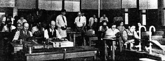 "The spread of amateur telescope making is a constant source of wonder to me," Mr. Porter writes. "Only last week I spent a delightful afternoon with a prominent movie star in Hollywood, who had made his six-inch telescope and is planning a ten. But the biggest kick came yesterday. Marshall saw a boy over a fence working on something that had the earmarks of a reflector. He stopped his car and came over to the fence. "'What you got there, boy?' "'Telescope." "'May I have a look?' "'Sure, but she doesn't work very good. I can see all right but there are a whole lot of images.' "Marshall looked down the tube. "'Did you make the mirror?' "'Oh no, it's a shaving mirror I bought at the five-and-ten for 25 cents.' "'And the diagonal?' "'That's a piece of looking glass.' "He had taken the eyepiece from a small spyglass, and the whole affair was in a pasteboard tube swung in a wooden fork that rose from the three legs of his mother's Christmas tree stand. "Well, Marshall put him wise to the extra images and today we went up and photographed this young Richard Cale, aged 13, with his instrument. He had found a looking glass man who had silvered his mirror and ready-made diagonal, and in his hands was a copy of 'Amateur Telescope Making.' A look through the eyepiece at some distant clapboards and I could well appreciate the enthusiasm that shone in the boy's eyes. 'Now,' he said, 'I'm going to make a real telescope.' "'Fine,' I replied, 'and tomorrow after school, come down to Cal. Tech. and I'll show you how we are trying to make a real telescope' (meaning the 200-inch). " 'Oh gee, will you? "' So this lad whom Porter took in tow probably saw more about the 200-inch telescope than most of us have seen-which is mighty little more than nothing at all. "I never saw Porter more enthused," Marshall writes, "than when he inspected the lad's enterprise." The photograph was taken by Marshall, who is a sort of amateur professional photographer, or a professional amateur. CALIFORNIA is still making plenty of telescopes. From the Telescope Class, Franklin High School, Los Angeles, comes the wide photograph reproduced below, and the following comment: "Los Angeles Public Schools now have a class in telescope making. There are about 40 pupils in the class, which meets at the Franklin Evening High School twice a week. All of the pupils intend to make complete telescopes; although at the present writing most of them are still working on their mirrors, which range in size from four to twelve inches. 'Amateur Telescope Making' is being used as the textbook with great success. Rex W. Beach of Los Angeles is the instructor. "The class was organized in February under the Federal Emergency Educational Program. A class of this kind constitutes a novel addition to the regular school curriculum and it is hoped that it can be made a permanent thing. A chemistry laboratory room was found to be ideal for making telescope mirrors. Telescope building is a large subject which can offer many worthwhile projects for other classes. For example, a good mounting can be made in either the woodshop class or in the metal shop class, the mirror can be silvered in the chemistry class, and the mathematical locations of celestial objects can be worked out in the mathematics or astronomy classes." A METHOD for lining up the optical parts of a Newtonian telescope, suggested by J. V. McAdam of Hastings-on- Hudson, N. Y., runs as follows "A, B and C are cardboard disks with 1/4" holes at center, covered with tinfoil having 1/8" holes at center. "D is a tube 8" long-cross hairs at one end, head in other end, with l/32" hole. Head lined with white cardboard having 1/8" central hole. Window in side of D to illuminate cardboard. "Remove prism and mirror. Line C up with A and B at about center of curvature of mirror, by sighting through A. "Remove A and B and insert prism, mirror, and D. "Adjust mirror to cast image on C, concentric with pinhole. This brings axis of mirror absolutely to axis of tube. "Adjust prism to bring spot in center of mirror, cross hairs in D and image of reflected from face of prism exactly coincident. This brings faces of prism square to mirror axis and ocular axis and insures rays converging on ocular being symmetrical about ocular axis. All parts should be securely clamped into position to prevent movement during adjustment." EVERY summer an informal convention of amateur telescope makers is held at the fountainhead of the telescope making hobby, Stellafane, near Springfield, Vermont, and A. D. Baker, Secretary of the Telescope Makers of Springfield, states that this year's meeting will be held on Saturday, July 21. Any reader not already familiar with these annual hob-nob gatherings is advised to throw his telescope into his car, leave his Sunday clothes at home, and come-or to come empty-handed. Don't await an engraved invitation-you won't receive one. An interest in telescopes and in other astronomically minded amateurs will be quite enough. Generally about 200 hobbyists attend these meetings. BOSTON has organized a club called the Amateur Telescope Makers of Boston. Wagn H. Hargbol of 600 Beech St., Roslindale, Massachusetts, is the president, and Miss Thelma Johnson, 11 Brogan Road, Medford, Massachusetts (who has made a telescope) is the secretary. About 30 attended the first meeting. Amateurs who would like to discuss clubbing together to have a batch of 16 or 20-inch mirror disks poured, and thus get a lower price if possible, are requested to write, not to us, but to Richard Perkin, 122 Chester Ave., Garden City, New York. If a dozen or so decide on uniform orders it is thought that the price per disk will be greatly reduced. Various workers who have tried to make laminated disks, in order in that way to obtain disks larger than the available stock sizes, have recently reported bad results. The disks seem for a time to hold up, and then slump. Alan R. Kirkham of Tacoma now reports the same experience, and sugge