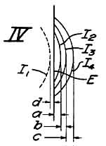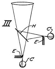 The scheme of III was gotten up to offset small image size and normally to throw half the light into each of two cells. Here H is a half-transmissive mirror and EE are sharp edges adjusted to pass half images. This form, however, requires duplication for the other two directions. Other physical forms we have worked on involve oscillating edge plates and prisms which will periodically throw light from an image portion on the cells. Those are probably too complicated mechanically, and on the whole the single prism set in out-of-focus arrangement appears best, particularly as the small prism element may be put on a star image in the focal field of the main objective, along with the photographic plate. One can readily visualize, mounted on the plate holder, a small element including the prism set and the cells. Microscopic observation of the image through the prism would facilitate setting. Russell W. Porter, who has made many suggestions [Nowhere print, but orally; the two are neighbors.--Ed.] has suggested that the prism might be a cone rather than a pyramid, and that the cone, like a pyramid, could be set base-on or point-on to the light. Condensers again could be used to gather the light spread by reflection from the cone's surface. He also suggests additional reflecting surfaces around the prism to reflect the beams up to the cells supported above the prism, in order to minimize the lateral space taken up at the plane of the plate holder. By mounting the guiding element at the plate holder, and applying the corrective movements directly to the holder, the inertia lag of the whole system may be reduced to a minimum. The plate holder may be made as light as possible, mounted on anti-friction bearings; and the final driving motors, utilizing the amplified currents from the cells, connected directly to the plate adjusting screws whose pitch would depend on the load, the requisite acceleration, and the motor characteristics. A motor of small inertia seems indicated. The inertial lag may thus be cut down to compare favorably with manual guiding. There is left, however, the sensitivity lag which is inherent in any such system and which appears to constitute the major difficulty. In the sketch IV, lag a may represent the distance beyond edge E, or beyond normal which the image must move in order to actuate the cell sufficiently to obtain a corrective result from the system. Suppose that b and c similarly represent time or inertia lags in the system. These latter may be reduced to much less than the corresponding lags in the average personal element in manual guiding; but the reduction of sensitivity lag a seems to present major difficulties. Assume the simple movement of the image from a normal position, on an excursion out and back. Sensitivity lag not only puts the plate movement behind the image on the way out and back, but, most important, brings the plate back to a stopping position short by an amount primarily equal to the sensitivity lag. Now, if inertia lag is equal to sensitivity lag, then the over-run of the mechanical parts may make up for the sensitivity lag, and finally bring the plate to proper position. That, however, depends on the assumption that the image is going to move back to normal in a straight line, an assumption by no means justified. Furthermore, the simple case of the image having a normal position from which it makes temporary excursions is probably not the fact, although the image undoubtedly does predominantly occupy a definite small circle. The actual fact is probably a constantly moving image; but, whatever the conditions may be, the sensitivity lag has the effect at all times of putting the plate position behind the image position by an amount dependent on the lag, even though the image may come to a position of effective rest.