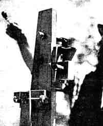 The wrinkle consists of a thumbscrew working in a half nut, and the virtue of it is that, while the springiness of the arm and a piece of spring brass to which the nut is attached holds it to whatever part of the screw it is placed against, it can be lifted off and shifted at once without a second's fuss. Barkelew has this wrinkle on both his R. A. and declination motions, and he writes that "if anyone is foolish enough to want to make one, I can tell him how this one can be improved without making it too fussy." His address is Great Republic Life Building, Los Angeles. This looks like a wrinkle well worth copying-study it over. Barkelew is the man who is interested in automatic photo-electric telescope guiding and who described his ideas on that subject in the August number. ON the opposite page at the bottom you will see a picture of a grinding machine made by Clark B. Hicks of the Amateur Telescope Makers of Indianapolis, of which V. E. Maier, 1306 Parker Avenue, that city, is secretary. Maier writes that Hicks' machine works just as smoothly as the best steel ones, although it is made entirely of wood with babbitt bearings. All the rotating parts are below the top of the table. The originality of this piece of work is manifest in the photograph: the lever at the right-hand corner, for adjusting the length of the stroke while running, the "model T" drag link with ball and socket joints at either end, making the mirror "full floating," and the improved Lee ratchet eliminating all bevel gears and driving rods on the link. By adjusting the transverse arm the equivalent of an elliptical stroke can be produced. WE learn that the Corning Glass works has supplied a 24 inch disk of Pyrex to the College of Puget Sound, Tacoma, and that the Amateur Telescope Makers of Tacoma will grind, polish and figure this mirror. Alan R. Kirkham will have charger of this job, with George Croston assisting. More amateurs doing professional work! HERE is A. W. Everest's latest revision of the previous revisions of the revised methods of using HCF laps, complementing or supplanting Part VIII of "Amateur Telescope Making." Everest writes: "We use HCF on the tool for bringing to a complete polish, paying no attention to the figure until then. Embed the HCF in a very thin layer of soft pitch-pitch in which at room temperature one pound pressure with the thumb nail will make a quarter inch dent in one second instead of the five seconds usually allowed for a pitch tool. The pitch layer should be thin enough so that the HCF will sink right through to the glass and become unyielding. It will maintain contact by wearing. After forming, dash on some water and rub all over lightly with a cake of Ivory soap. Then work the mirror back and forth a few times to produce a fine, bubbly suds before applying the rouge and water mixture; otherwise the rouge won't stay in place. "The polishing action of the HCF too must be kept in mind if you are to maintain top speed. Practically no rouge granules become embedded in the surfaces of the facets, as in the classical pitch tool. It is the wedge of rouge granules that form at the edge of each facet during each individual stroke that does the work. On the reverse stroke this wedge breaks away and another forms on the opposite side of each depression-and so on, back and forth. From the above you can see that only a small amount of the rouge in the mixture can be effective. Surplus rouge is worse than useless, as it piles up to the extent that it rolls over the facets, wearing them down too fast. A heaping teaspoon in half a glass of water is sufficient. If you can look through the mirror and see all the facets as you work, all is well. "For the final figuring I recommend a pitch tool." Norman Shillinger, 403 Commerce Street. Wilmerding, Pa., finds that cutting channels in a lap under water will prevent chipping the lap-like cutting glass with shears under water. HERE is a letter received from Clayton R. Tinsley, president of the Tinsley Laboratories in Berkeley, California (3017 Wheeler Street): "Tinsley Laboratories desires to offer the following contribution: We note that not more than five percent of mirrors sent to us for silvering are fully polished. The following test, used by us on our own work, might be a revelation to many. "Take a small reading glass or other simple lens and, using it as a burning glass, throw a bright spot upon the supposed polished surface. Either an electric light or the sun may be used, though the latter is much the better. A surface which seems quite fair using a magnifying glass in the usual manner will now appear as a gravel bed even to the naked eye. If the test seems too drastic, try it out on a professionally polished surface, such as a B. and L. prism. If the prism surface is clean and free from grease, even the most intense 'burning glass' spot can scarcely be detected by front face reflection." At the risk of being lynched, your scribe will add that he is suspicious that many of the short, two-and three-hour polishing jobs he constantly hears of will not pass this test. Please accompany future claims with affidavits sworn on A.T.M. The old chestnut about local figuring with the ball of the thumb is up again for discussion. We wrote to J. W. Fecker for his opinion. His reply was: "This is definitely one of those myths the origin of which nobody knows, but it nevertheless persists." In spite of this we frequently hear that this was the lost, secret method used by the great professionals. We are from Mo.