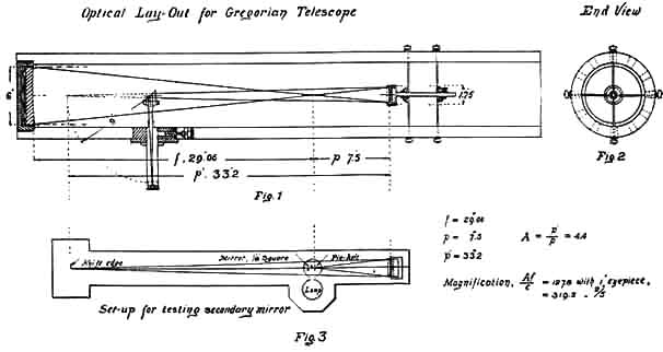 "The difficulty of making an optical flat or an accurate spherical mirror for testing purposes only, need no longer deter the amateur who has the ambition to make a compound telescope; these accessories are not absolutely necessary, as once believed. Kirkham's method of testing Gregorians from foci is entirely practical and within the capacity of anyone who can make a good Newtonian telescope. "My first telescope, illustrated in the December, 1933, number of SCIENTIFIC AMERICAN, was a six-inch Newtonian. I afterward made an eight-inch, f/9, Newtonian which proved so much better than the first that I had no further use for the six-inch. It then occurred to me that I might use the six-inch tube for a small Gregorian. "I decided, in the first instance, on a 6-inch f/5 primary, with a 1.75-inch secondary, making p=7.5 inches. These values are in proportion to Hindle's example in 'Amateur Telescope Making' and fit into my 54-inch tube as though it were made for them. It took just one month of my spare time to make the change, and I now have a good compound telescope of convenient dimensions and considerable magnifying power. Because of the small size of my primary, which was limited by the size of my old tube, I did not seek a very high magnifying power; but the new telescope is very satisfactory, and I feel amply repaid for the effort. "My Gregorian is of the non-perforate type. (See drawing.) I use a one-inch prism located about a foot from the primary mirror. This comes near enough to the declination axis to make the eyepiece always convenient. Instead of an adjustable adapter tube, I slide the block which carries the eyepiece tube between two of the strips of my wooden telescope tube, and pick up the focus wherever it may be. I have a thumb screw adjustment for accurate focusing. "While it is necessary to keep rather closely to the values of f, p and p' employed in determining the RC of the secondary, the latter can easily be figured by Kirkham's method, even though f and p' vary slightly from assumed values. This is fortunate, for it is extremely difficult to keep these dimensions from varying slightly during final polishing and figuring. "It is better, in this case, to keep the value of p constant, and absolutely necessary to figure the mirrors accurately. "The primary must be a true paraboloid and the secondary a true ellipsoid. It bothered me at first to know how I was to determine when the secondary was correctly figured; but I found it was only necessary to apply the test for a perfect spherical surface: in other words, an apparently flat surface, with the pin hole at one focus and the knife edge at the other. In such a test an ellipsoidal surface will appear perfectly flat at the outer focus. This test is really more delicate than Foucault's center of curvature test, for the reason that conditions are precisely the same as when a star is under observation-which is not true in the other case. "Any variation of f, p or p', of course, varies the amplifying power slightly, but this is relatively unimportant. "It took me several hours to line up the optical elements properly, as this is tedious, but only slight adjustments were afterwards necessary. "I secure the telescope to the saddle by means of leather straps, and take it into the house when not in use. My long focus Newtonian fits into the same saddle." Figures 1, 2, and 3, show the optical layout and details. SO much for Mr. Decker's Gregorian. From another worker who is making a Greg we have received the following comments, suggesting that the Greg is not a suitable job for a beginner (we constantly receive inquiries from beginners who want to tackle one as their maiden job): "The biggest job about the Gregorian is the mounting. I find that the positions of the Greg mirrors are very critical. Unless they are exactly right, you get blurred images with tails. It is a tough job to line up a system of this sort, and it is highly important that provision be made for adjustment in every direction-lengthwise, crosswise, tilting, and so on-and for locking the parts firmly after they are once set correctly. A Greg is not a job for a beginner -it's a difficult job for any one. The high magnification of the Greg results in a small field, and it is hard to keep objects in view. Jupiter sails across it like an airplane."