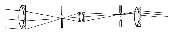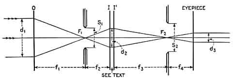 Telescope Sights THERE are so many ways of building a telescope sight that to describe any single way is almost certain to invite hearty disapproval if not derision from various sources. However, in the following account, we shall describe a simple method which, beside requiring neither knowledge of mathematics nor tedious computation, has in practice been used to produce sights which have at least no obvious faults. It should be borne in mind that more refined and theoretically superior sights can be designed, but only at a tremendous cost in time spent in ray tracing and analytical calculation. While not extremely difficult, such computation is very complicated and time-consuming, and if the improvement is really only theoretical, its value may be questioned. Should one aspire to such things, the best recourse is to Conrady's "Applied Optics and Optical Design" or kindred treatises, of which the one mentioned is no doubt the most exhaustive. Figure 1 shows the paths of light rays emanating from an element in the bull's-eye with the rifle expertly aimed. The rays are considered to be parallel up to O, the objective. They converge to a focus F2 after which they diverge, falling on I and I', the erector lenses, which cause them to converge again to a new focus at F2. At F1 the image is inverted, while at F2 it is erect and is viewed through a low power eyepiece. In order to have the requisite eye distance, this should be a thin cemented doublet. The focal lengths of the four lenses are f2, f2, f3, and f4, respectively. The erector magnification is f3/f2 and the focal length of the objective should be multiplied by that value, in order to find the equivalent focal length of the entire sight exclusive of the eyepiece. Calling this F, we have F/f4 the magnification with any eyepiece of focal length f4. If there is a separation between the erector lenses, the distance doesn't count, but once worked out, a variation in their separation will result in different magnification. The use of this property in securing adjustable magnification is nevertheless attended with considerable difficulty, since the whole unit must move as the separation is varied if the telescope is to remain in focus. The exit pupil diameter is perhaps the best place to begin in finding the diameters of the lenses and stops. In general, a large exit pupil will necessitate a large objective. The exit pupil diameter, d3, is the effective diameter of the objective, d1, divided by the magnification. A large exit pupil is therefore obtained with low magnifications, and is desirable for hunting sights where it is inconvenient to take time in getting the eye exactly in line with the telescope. For this class of sights, 2X to 4X with exit pupils 1/4 to 1/6-inch diameter is suggested. For target shooting, smaller exit pupils may be employed, even as small as 1/10 to 1/12 inch, which makes higher powers obtainable. The apparent field of view is about equal to the stop diameter S2 at the eye distance. The diameter of the eye-piece should be equal to the stop diameter plus the exit pupil diameter. The erector lenses should be f3/f4 times the exit pupil diameter, after allowing a rim for mounting. If they are separated somewhat, make them a trifle larger and put a stop of that diameter between. The diameter of the stop S1 is now f2/f3 times that of S2. The objective diameter is given by The first part of the expression