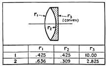 D (i.e., to a target), is Figure 2 indicates how the lenses should be turned, and also shows the paths of light rays from an object at the edge of the field. Figure 3 gives the construction of each lens. The hatched component represents ordinary flint glass of refractive index 1.615, and dispersion 36.6. The convex lenses may be made from borosilicate crown glass of refractive index 1.517 and dispersion 64.5, or of barium crown having an index of refraction 1.576 and dispersion 57.3. The radii for an aplanatic lens are given in the table in Figure 3, and have only to be multiplied by the desired focal length to obtain working data. The first row is for borosilicate crown and dense flint, as above, and the second is for the barium-crown-denseflint combination, which has somewhat better color correction, and a considerably flatter field. The barium crown is not as durable, however and requires making more laps. (To be concluded.) IN the October number we published the Tinsley Laboratories' statement that no 5 percent of the mirrors sent them for silvering were fully polished out. Between the time when that note was inserted and its later appearance, two others wrote us virtually the same statement. B. L. Souther of Pittsburgh, who does silvering, and the American Telescope Company of the same city, who do aluminizing, each state that the great majority of mirrors sent them are far from polished out. Apropos this, J. H. Hindle of England gives the following method of detecting the most minute pit and scratches: Place a lamp at the right of center of curvature, where the pinhole normally goes in the knife-edge test. Then place the eye where the knife-edge would go. Move the head so that just the edge of the cone of reflected rays is seen. Defects of a kind normally seen only on focogram will be rendered visible. Mr. Hindle has commented, when on a recent visit to this country, on our note in the September number, regarding fictitious accuracy in measuring the radii of zones to thousandth of an inch. He does not undertake to measure closer than one 150th inch and believes closer attempts to be self-deceptive. YOUR scribe complains that dealers omit to send him their catalogs, and leave him guessing where to direct inquirers for this and that. But one-a nice one, at that, with included star charts--has now come in unsolicited from the Optical Research Associates, of Plainfield, New Jersey, and this was so affecting that three big bandanna handkerchiefs were cried soaking wet. Mention of name is for revenge on others, and is not a precedent.