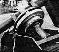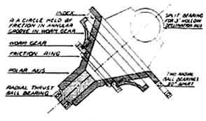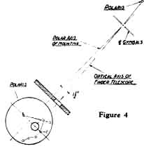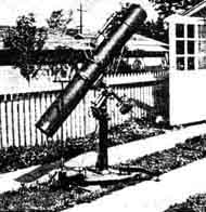 "The photograph, Figure 1, shows the mobile mounting truck. The retractile (swinging) stabilisers are used for alining the polar finder upon Polaris, as explained later. The steering tongue is detachable. The brace rods were found materially to reduce the oscillation of the mounting, which is inherent in the slender pedestal shown. "The worm gearing of the hand drive is made with a V-form thread, the wheel having been hobbed with a 5/8", 11-thread USS tap. The V-form gear tooth is satisfactory for this service, if an arrangement be provided for accurately adjusting the backlash or looseness of the worm and wheel. "The equatorial mounting was made, partly, from parts supplied by Mr. Elias. It is provided with babbitted bearings, which are found to be superior, in point of performance, to the ball bearings installed in an instrument built previously by others. Ball bearings have so little inherent friction that the instrument will not retain a given setting unless the brakes are set with some force. "The circle wheels were made from gear wheel castings. The outer rim (in which teeth are cut) was turned down and that surface given a 1/8-inch coating of hard (bronze) solder. This was again turned down until a smooth surface was produced The circumference was divided in an engine lathe, using the lathe's gearing as an available indexing or dividing device. "The polar axis finder, a new feature (Figures 2 and 3) designed by the writer, is arranged to compensate, semi-automatically, the angular distance of 1 degree 07" between the celestial pole and Polaris. The constellation Ursa Major is represented upon a disk, which is revolved until the position of its markings corresponds to the apparent position of the constellation itself in the sky at the time. If the main mounting of the telescope proper is then adjusted until Polaris is seen at the juncture of the cross hairs in the polar-axis finder, the polar-axis of the mounting will be found to be almost precisely parallel with the axis of the earth. The finder is mounted in gymbals (Figure 2) at its upper end, and the eyepiece draw tube is passed through an eccentric hole in a disk, which is rotatably mounted upon the frame of the equatorial mounting. This disk is engraved with a representation of the constellation Ursa Major and Polaris. "First, the mounting is roughly set into alinement with the celestial pole, and the triangularly placed hand screws on the base are turned down against the ground. By varying the relative adjustment of these hand screws Polaris is brought to the intersection of the cross hairs in the finder. As shown in Figure 4, if Polaris is seen at the intersection, then the polar axis of the instrument will be almost precisely alined upon the celestial pole. I made this finder from the lenses of an old Kodak, and it was found to be quite satisfactory for its purpose." WALLY EVEREST, that famous landmark of Pittsfield, Mass. (15 Allengate Ave.), after being teased and teased (he is so shy) has kindly furnished us several pictures of "The Old Town Pump," also a noted landmark in that quaint New England hamlet. How did it come to be e called Ye Olde Town Pump? Well, somebody thought the polar axis looked like a pump handle and, after that, that was that. Ye Olde Towne Pump has a Pyrex mirror, and look (turn the page) at those Ronchi bands! Everest had made 149 optical surfaces before he turned this one off, and this was his 150th. What we like about it shows best in Wally's "longitudinal cross-section" (as some genius recently described it): its rigidity. Study the details of that tapered polar axis. Then take a squint at the diameter of the declination axis. Then note the unusual setting circles-the indexing does not show, in the photograph, on either circle, as the light evidently caught them wrong. The declination circle is the light colored streak, in line with the polar axis. Note also the worms and the rollers. A fine design. We also received some other photographs of Everest as an artist's model but this is not an arty magazine, hence they had to be suppressed even if Anthony Comstock is no longer an obstacle. Too bad- they were beauties. AND now we learn that Mary A. (Mrs. A. W.) Everest, same address, has made the first feminine aplanat on earth, so everybody give three cheers and three times three! And here, in the photograph, is Miss Sylvia Petersen, 963 Tenth Ave., St. Petersburg, Fla., with a Newtonian telescope she made. The moon in the background, likewise the stars, are not the real ones. Miss Petersen was chosen "Miss America" in a recent beauty pageant. SEVERAL have worked out ways-some rather complicated and mathematical, some less so-for making the Ronchi test quantitative as well as qualitative, and the first to be published was that of J. H. King in the Journal of the Optical Society of America, Sept., 1934. We have been asked who was the first to work out a method, and the answer is, we do not know. Several evidently were at work on this problem at about the same period-Loren L. Shumaker of Dayton being one. Alan R. Kirkham of Tacoma, for example, sent us an outline of his method in March, 1934, and he has now, at our request, sent us the following succinct statement which is a paraphrase of the one he sent us then, and which we unjustly mislaid and overlooked at the time. "The Ronchi test may be used to measure the overall correction of a mirror very simply, in the following manner: Adjust the grating so that two bands at the center of the disk are 1 inch apart (say) and mark the position. Now move the grating back so that the bands are 1 inch apart at the rim. The move should amount