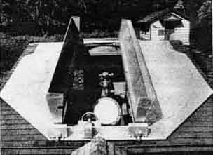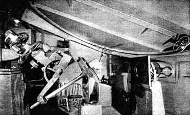 "Protection against temperature effects is not necessary to those who use a new telescope at the Roslyn House Observatory, Wynnewood, Pennsylvania. This unique institution, the private observatory of Mr. Gustavus Wynne Cook, Philadelphia banker and manufacturer, has been described in previous articles in SCIENTIFIC AMERICAN (August 1932, p. 74, January 1934, P. 17). To own a well-equipped 28-1/2 inch reflecting telescope, provided with a large spectograph so that it is used regularly on a research program for measuring the radial velocities of the stars-not to mention the 40-foot focal length sun camera, the spectrohelioscope the astronomical transit instrument, a 7-inch aperture and meridian circle and other items that would be creditable in any college observatory-might satisfy many persons. But Mr. Cook is not happy unless he is putting up a new telescope, and the latest addition has now been in use only a few months. With it he sits in a nicely furnished, and heated, room. At one end is an assortment of dials that reminds one of the control room of a submarine, and an eyepiece tube that might represent the end of a periscope. Without moving his head, the observer can press buttons and view almost any part of the sky. The dials automatically show exactly the position of the region at which he is looking. "This is the latest form of siderostat telescope. Such instruments are not new in principle, as the first was designed by the French astronomer Leon Foucault, who died in 1868, and a huge one was displayed at the Paris Exposition in 1900. But now, probably for the first time, such a telescope has been constructed which makes full use of modern electrical equipment so that the operation is not as much trouble as driving an automobile. The flat mirror is mounted in a vertical fork, so that it can turn freely around either a vertical or a horizontal axis. Attached to the back of the mirror, projecting out at right angles to its plane, is a rod. The driving mechanism is placed immediately to the north, and is equipped with a polar axis which turns once in 24 hours. Attached to this is an arm which moves north and south, and at the end of this arm is a sleeve on which slides the rod attached to the mirror. This mechanism is shown in one of the photographs. By means of it, the mirror is automatically moved at exactly the right speed for each declination. The instrument is adjusted in declination by moving the arm attached to the polar axis. The tube of such telescopes is usually placed to the south of the mirror, so that the eastern and western halves of the sky may be reached with equal ease. "The objective of the Roslyn House instrument is of 15 inches aperture and 225 inches focal length. It was made in 1907 by John A. Brashear, and remained unused until purchased by Mr. Cook. It was tested by J. W. Fecker, of Pittsburgh, successor to the Brashear firm, who pronounced it excellent. "Mr. Cook was undecided as to how he should mount this objective. The conventional mounting, with the dome, would have been as large as a two-story house, and out of keeping with the residence and other buildings nearby, in addition to lacking the advantages of a warm observing room. A polar telescope would have required the erection of a somewhat unsightly tower, so a horizontal telescope was definitely indicated. "Accordingly, Mr. Fecker was given the contract for the instrument, and the buildings were designed by Mr. Cook and built under his direction The Pyrex glass plane mirror, 25 inches diameter, the driving mechanism, and the lens, are mounted on concrete piers in a small square building, provided with a circular, rotating roof, in which a wide slit can be opened to expose the mirror to the sky. At present the mirror is coated with silver, but equipment is being built to give it an aluminum surface. The tube of the telescope extends to the south, across a short open stretch and into the other building which, in turn, connects with the transit room, a clock room, and the room for the 2-1/2 inch reflector. The observing room is heated from a heating plant some yards away. The breech of the telescope, and the various dials, are mounted on a third concrete pier to give the greatest possible stability against vibration. "A total of 12 motors is used in the operation of the instrument. One is a synchronous motor for the main drive of the polar axis. Two motors are used for the motions in right ascension and declination, the same motors serving for the fast and slow motions by shifting an electrically operated clutch. A motor generator supplies direct current to operate the numerous relays. A second synchronous motor turns the eyepiece, when used for photography, as there is a rotation of the image, and a third operates a dial to show sidereal time so that the instrument can be set directly to a star's R. A. without stopping to figure out the hour angle, which is normally necessary. A pair of Selsyn motors connects this dial with the polar axis, and another pair connects another dial with the declination axis. Selsyn motors are "self-synchronizing," and when two are connected to the same power source the shaft of one turns in exact step with that of the other, as if they were mechanically coupled, even though miles of wire might intervene between them. Other motors operate an iris diaphragm over the lens, and the rotating roof. "Mr. Cook intends to use the instrument to a great extent for photography, and the support of the objective is now being slightly modified to simplify the attachment of the photographic compensating lens, which shortens the focal length. Guiding for photography may be done in two ways, one by using a double-slide plateholder, with two eyepieces on each side of the plate, through which stars just out of the field being photographed are kept in view on cross hairs. The other way is with a separate 6-1/2 inch lens (see photograph), of the same focal length as the large objective, which is