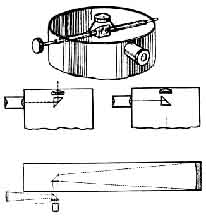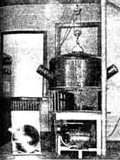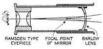 a Hindle sphere, these surfaces must be pretty near to fairly good: "All of the above was done with 120-line- per-inch Lower wire grating and smoked razor blade. In all comparisons, source (pinhole) and eye were precisely together on the axis. Surfaces used had apertures of 1.09, 1.4, 2.3, 3.5, 4.5, 6, 8, 10 and 11.3. Sensitivity was judged by polishing grooves in surfaces with pitch laps l/8" diameter, loaded 50 grams per square centimeter, and using black rouge washed from worn-down stock. "Don't forget," Selby adds, "that other may not get the same results." Comments on the above: Everest-"I choose the old tin can and razor blade." Sheib- "Interesting. I agree with Selby on No. 3, also No. 4 and No. 5. I am not sure I agree with him on No. 1 or No. 2." Well, there it is-now it is a public fight along with who is going to be the next president. Great pains should be taken t eliminate variables, in making tests similar to these. HERE are some further data from Selby who is the one who made the "dinosaur" telescope described last July, also whole fleet of flats. "Regarding the cutting speeds of polishing materials," he says, "I find: "With very hard pitch, No. 600 pits, load 50 grams per sq. cm., stroke 250" per min: "Very hard laps of pure pitch polish much slower than pure pitch laps of medium hardness on Pyrex. "Regarding tendency to scratch, with superhard laps on Pyrex, B. and L. sleeks and scratches least, Clark next, then Fuller's black, then Am. Opt. Co., and worst, H. W. and M.; although, with a medium lap, none scratches at all." Naturally, this is only one man's findings. He does not claim they are final. In Selby's notes, "Black Arg. Glass" refers to a special melt called "Marbletex," from Wells Glass Co., Kokomo, Ind. "H. W. and M." refers to Hanson, van Winkle and Munning Co., East Matawan, N. J. "Clark" refers to Alvan Clark and Sons Co., '' Somerville, Mass. The other two are mentioned in "A. T. M." The black "rouge" was from W. P. Fuller Co., San Diego, Calif. Binney and Smith, 41 East 42 St., New York, make black rouge but your scribe has not yet tested it. Some black "rouge" which H. A. Lower sent him proved to be as scratchless as a newly hatched chick. It is slow (note Selby's figures), but after no end of trouble with scratches Lower found it a haven of rest. THE cut at left shows how W. B. Hiner, 123 Cleaves Ave., San Jose, Calif., added a Barlow lens to an eyepiece. In this case it was one component of an old camera lens, a meniscus. The Barlow principle is explained by Hindle, in "A. T. M.," p. 215. If the lens is arranged to slide along the axis, as explained in "Splendour of the Heavens," p. 751, the amount of magnification may be varied at will. A NEW aluminum evaporating outfit installed by Leroy M. E. Clausing of Chicago is shown opposite. He writes: "The enclosed print is one that I made of the evaporating outfit. The streaks of super brilliancy on the 20" flat are not caused by super-reflection, but are due to my moving the light to the wrong place while taking the picture.
