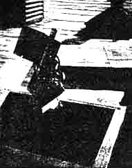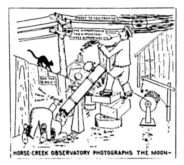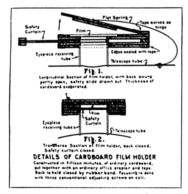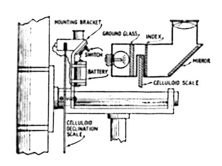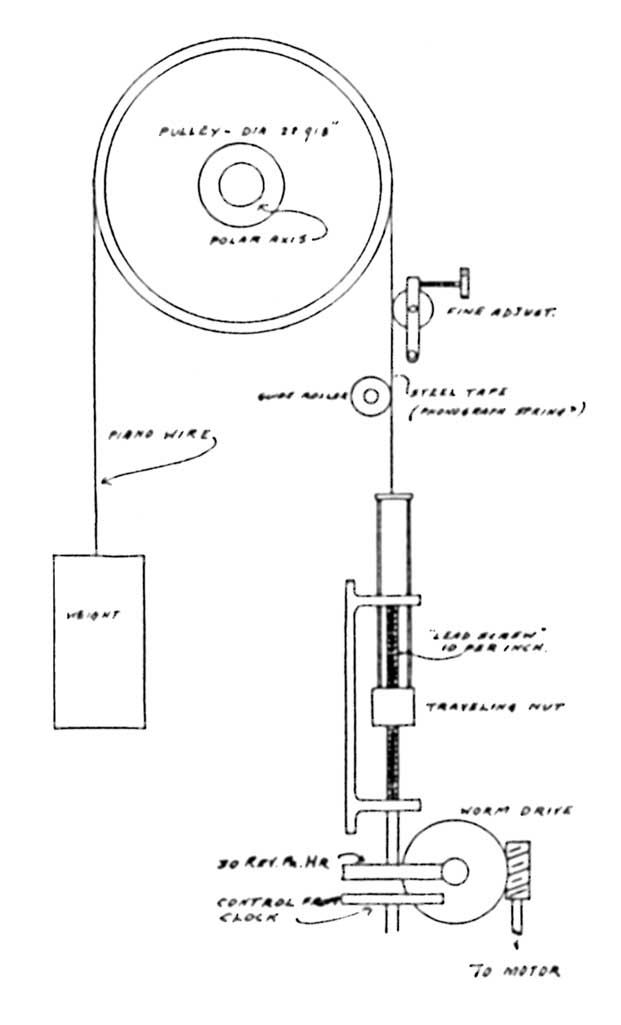 For photographic work the Schmidt telescopic camera, with its oddly curved correcting lens in front, is as far ahead of a telescope camera having an ordinary paraboloidal mirror without a correcting lens, as a paraboloidal mirror is ahead of a spherical mirror for usual work-farther, in fact. Oddly enough, the Schmidt reverts to a spherical primary but it is its correcting lens that does all the business of knocking out the coma that otherwise puts tails on star images at the edge of the plate and, in fact, on all except the central eighth of a degree or so of plates taken with paraboloidal mirrors such as the 100-inch. But a Schmidt gives a good field 12 degrees or more diameter-no tails. The spherical primary is said by some writers who have never tried to make a real sphere to be easier than a paraboloid but, be that as it may, the real grief or "piece of resistence" in the Schmidt job is in the correcting plate. This is a thin piece of glass at the outer end of the tube, its curve so inconspicuous that the plate resembles an ordinary piece of thin, unaltered glass. But the extremely shallow curve is neither spherical nor paraboloidal but decreases in radius as the edge is approached, and it must be made by means of a flexible lap and a combination of patience, intuition, experience, bad language, cut and try, and occasional sheer good luck. It is not beginner's work and perhaps it is not merely fairly experienced work, but definitely is advanced work. The whole business- theory and practice-will be covered in the "A.T.M. Supplement," due in a few months -please don't ask when, for this depends on when the last cunctative contributor sends in his material. The last contributor whose long-promised "copy" comes in is to receive a prize of an invisible telescope in an intangible, imponderable carrying case. In the meantime, here are Harold Lower's comments on some of the first photographs he and his father, Charles Lower, took with the Lower Schmidt, which embodies the famous "Soup Bowl" mirror. "The 'candid camera' shot of Dad lighting a cigaret shows what one second exposure does, by the light of a match," he writes. "This is made at a distance of 12 feet. Lens wide open. The night picture of San Diego (page 249.-Ed.) was made from Point Loma, across the Bay. Exposure 10 seconds, and over-exposed. By examining the negative with a glass one can count the windows in buildings which are more than four miles away, but it is so badly over-exposed that they don't show in the print. The two pictures of the camera with one side removed were made before the interior was blackened, so as to show the parts in position." The crossed strings in the left hand (lower) picture were placed there for help in the very delicate, critical collimation and are not a permanent feature. BELOW right and left are drawings of two items from Cyril G. Wates, 7718 Jasper Ave., Edmonton, Alberta, Canada. The first is a gadget to permit easy reading of setting circles in the dark. "The scale proper. Wates writes, "is a disk of 1/16" Celluloid one side of which is sprayed with black Duco. The scale divisions are cut through the Duco with a sharp knife, and the numerals scratched with a scriber. Work with a light under the Celluloid. This method gives very fine markings. "The scale is attached to a collar which clamps to a declination axis by a set- screw, The drawing shows the common German type of mounting, but the same principle could be adapted to any mounting. The lens is a ten-cent magnifier. The mirror may be thin glass, silvered on the front and lacquered. I used a bit of chromium plated metal. The 'index' is a piece of Celluloid with a vertical line scribed and blackened. It should be as close to the scale as possible, in order to avoid parallax. Note that the Duco side of the scale must be next to the lamp, and that the base of the numerals must be toward the edge, as the mirror inverts. "The lamp is a 3-volt flashlight globe working on one cell, to give a faint light. The socket and one side of the switch are 'grounded' on the mounting. This scale is delightful to use The divisions are seen very clearly, yet the eye is not dazzled as when using a flashlight.'' It is suggested that the light be of as low candlepower as will clearly reveal the markings, thus not unduly causing the pupil of the observer's eye to close. Mr. Wates' next item is a suggestion for a drive for an equatorial mounting. The drawing is his. "This drive is planned for a very heavy, double yoke mounting for a 12" telescope, but could easily be adapted for other mountings, such as the common German type, by means of an extension on the polar axis. "The actual drive consists of a screw such as is used in screw-cutting lathes, with a split nut. These screws are accurate within .0003" per inch length. The nut runs in guides (not shown), and has a thrust ball hearing at the top. The screw turns ( by means of suitable gearing) at a speed slightly in excess of 30 rev. per hour. The motor should be variable speed if possible. Mounted on the polar axis is a pulley 72" in circumference. A suitable pulley could be picked up at any junk shop, although possibly not of the exact diameter. It would be a simple matter to alter the design and gear ratio to accommodate any pulley or screw that happened to be available. "On the left is a heavy drive weight suspended on a suitable steel wire passing around the pulley. On the right is a steel tape attached to a yoke, which in turn is fastened to the nut. The wire and tape lie on the pulley side by side-they are not joined. Each is fastened to a stud on the face of the pulley. The pulley is a loose fit on the polar axis and can be clamped thereto by a clutch, not shown. The fine adjustment is obvious from the drawing. "Exact speed control will be by the so called 'Chaser' system. The wheel marked 'control from clock' is not attached to the screw drive in any way, but is an entirely separate wheel driven by a pen