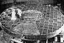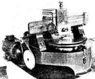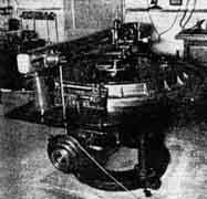 "A general description of this machine will interest any amateur who has made a reflecting telescope. "In Figure 1, l is the table on which the disk will remain throughout the grinding, polishing, and figuring-in fact it is the cell of the telescope tube itself, and the mirror will never leave it after it is finished. The individual supporting units are not shown. The table is on trunnions that allow the mirror to be brought to vertical for testing. "The grinding and polishing tools are controlled by a rotating spindle or driving pin, attached to the trolley 2. This trolley moves back and forth transversely on the bridge 3. This bridge in turn travels longitudinally on tracks 4, attached to the main frame of the machine. "The driving mechanism for both the trolley and bridge motions is the scotch yoke. Figure 2 looks down on the trolley yoke, and Figure 3 is a side view showing one of the pair of yokes that move the bridge. The tracks supporting the bridge are extended at the rear of the machine so that polishing tools may be well away from the table for warming the pitch facets preparatory for hot pressing, and also for washing off the grinding tools. "At 5, Figure l, is the control station where the operator has complete electrical control of all the various motors and motions. 'The maximum stroke is 6 feet for the trolley, and 6 feet for the bridge. When used together, the tools may be made to move in a variety of strokes. Speeds on the track are from 8 to 25 feet per minute. "Figure 4 shows the full size tool in process of being covered. When ready for grinding it will be covered with 1928 glass facets cemented to its convex surface. As is generally known the 200-inch disk was cast in an open mold and hence its surface is approximately flat. Some 3-1/4 tons of glass will have to be removed to bring the mirror to its spherical shape. The sagitta or depression amounts to 3.8 inches. Small size cast-iron tools will be used for roughing out the curve before using the full size tool. "The first operation on the disk will to place it face down on the table (which is covered with 2 inches of sponge rubber and carefully calibrate the positions of the 36 holes destined to receive the supporting units that will carry this 17 tons of glass internally all inclinations to gravity. The holes will then be ground out, the back ground, and the edge ground. The disk will then be turned over and the rough grinding of its surface commenced. "The 120-inch Hat disk received earlier has a machine of its own, similar to the machine here shown but smaller and with a different driving mechanism. The disk at present is fine grain and flat to 0.00012 of an inch (concave) Its flatness was controlled during grinding by testing its surface with a stretched piano wire, but sufficient reflection was obtained at grazing incidence to allow a optical check test which confirmed those of the piano wire, Polishing and figuring this ten-foot flat will not be started until the 200-inch mirror is figured spherical the reason being obvious to mirror make who have made flats for testing at the focus. "The room in which the work is do is 165 feet long, 52 feet wide, and 39 feet high. The walls are covered with cork insulation. There are no windows. The room is illuminated from overhead by electric lights in the roof, and by mercury vapor lamps around the walls. The air is conditioned, washed, tempered, and given the requisite amount of humidity. The opticians like to work in a rather high humidity and a temperature of about 70 degrees. "A visitor's gallery is provided, separated by a glass partition, so that the public may see what is going on at any time. I never go into the optical shop-and I go there quite often-without seeing several faces glued to that glass partition, evidently wondering what it is all about. And you will find them there for the next four years-the scheduled time for completion." NUMEROUS readers have asked us why we did not, beginning several years ago, publish the data about the design of the 200" telescope. The reason was that, while the project was announced several years ago, the design was not settled-it had only been begun. It will be understandable why those who have had the most to do with it did not wish to rush into print at each successive stage of the constantly changing evolution. Now that most of the design has been settled and actual construction begun, we hope occasionally to give our readers some of the homely details, written not as the average new reporter would describe them for a general audience but for the telescope maker. AMONG amateur telescope makers and doers of practical things in England is F. J. Hargreaves, Director of the Photography Section of the British Astronomical Association-an amateur association which we have previously urged American amateurs to join in order to obtain the a monthly Journal, which is a live one. Mr. Hargreaves now sends us from Mirastelle, Woodland Way, Kingswood, Surrey, England, the following communication: "The purpose of this letter is to enlist your help in a matter which I and some of my friends have very much at heart. I refer to the systematic observation of the surface features of Jupiter. This subject also supplies an answer to the question in the second paragraph on page XI of 'The Book.' "The systematic observation of Jupiter seems to be indigenous to this country. Observers elsewhere make occasional observations, sometimes of great value, but nowhere else, so far as I know, do observers watch the planet on all available occasions, for hours on end, timing the transits of markings across the central meridian. "The trouble, however, is that England lies in high northern latitudes, and when Jupiter is below the equator the opportunities for observing it here fall off grievously. Last apparition, for example, my total of transits was only 220, as against 1500 and more in previous years. The present apparition will be worse. "There is nobod
