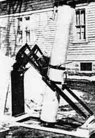 Figure 1: India, Calcutta, 28 Gangadhar Babu Lane, Hari Charan Datta. 'It was an auspicious day indeed when I chanced upon the advertisement of your book 'Amateur Telescope Making.' The book was a god-send to me, Please accept my sincerest thanks and salaams. "The mirror was ground from a disk of plate glass 3/4" thick and 5.65" in diameter, on a similar glass, using the inverting device of Mr. Porter, as illustrated on page 288. Time consumed, about 18 working hours using Carborundum powders. The mirror was polished on a rosin and beeswax lap. The best proportion. after many trials here at Calcutta at that time (middle of October), as found to he l in 20 and the best method of cutting the channels was found to he sawing, as advised by Mr. Pierce. The hack saw blade was kept rubbed on soap. It took me about 40 hours to polish and 10 more to parabolize. I made all the tests, including the Ronchi test, which was done by 8 strands of hair spaced one tenth inch. The total cost of my instrument was about 24 rupees [about $9.- Ed.]. my sincerest thanks and salaams for distributing the knowledge by means of which a novice like me on the other side of thc globe has made a telescope." Figure 2: Japan, Yokohama, 140 Mamegochi-dai; R. M. DeMuth. The capstan for turning the head of the tube is interesting. No other data were received. Figure 3: South Africa, Capetown, Mowbray, Clifton Road, "Tircrevan," W. G. Andrews, 'I was able to get 6" disks in Capetown but could not get Carborundum grains till I mentioned it at the Astronomical Society, when I received any amount It was only after the mirror had been finished that I discovered that I had been using paving asphalt, but had not the slightest trouble with the lap. I had been reading in 'A.T.M. 'about the many different figures I might strike but had beginner's luck, as almost the first test was paraboloid; so, to see them, I rubbed several holes in the mirror, and then I did see them! It took several hours to get it parabolized again. The 2-1/4" finder was salved from a wreck in False Bay. The total cost was under £1." Figure 4: Manchu-kuo, Harbin, Slavianskaya St., P. Ramensky. "The mirror is of 6" diameter and gives magnifications up to 300 diameters. The mounting is from Ford rear axles." Figure 5: New Zealand, Auckland, W. 2. Grey Lynn, West End Estate, 161 Garnet Road' Alf R. Martin. "I enclose a photo `of a 12" reflector built by myself. It is mounted on Ford back axle housings. There are quite a number of amateur observers here. Recently, in this city, we have formed a club and meet once a month for discussion." Home, James. ABOUT making camera lenses: From time to time since this hobby of amateur optics was got going in 1926, requests for instructions for making camera lenses have been received. A number of years ago we addressed letters to some of the photographic journals, asking for light on this situation and parts of the replies, published below, still make interesting reading; they show that the job surely is not a beginner's job, also perhaps that the ability of at least some amateurs may have been a bit underrated. It is true, however, that at that time there were few who could be called advanced amateurs, as there are today. The first letter: "I am afraid you are up against a tough proposition. The photographic lens is entirely different in conditions from the telescope lens in that it must cover a very wide field at a large opening, say 80 degrees at F/4.5, with minimum errors. "Photographic lens computation is not easy. Lens designers are only able to compute about one lens per year. Even Dr. Rudolph, one of the most famous, calculates only one in about two years." The second letter: "We have not published material of this kind for three reasons: first, the calculations involved are over the heads of the majority of our readers; second, even if the calculations were understood, few, if any, readers would have the necessary grades of optical glass or the mechanical equipment to produce the lenses, and, third the manufacturers keep their lens calculations a trade secret." The third letter: "Personally I am averse to exploiting making things at home which can be bought better made and often at lower cost in the shops. This is not wholly a commercial expedient, either. It is based on two facts, the mass of readers cannot make complex things, and the price of such things is usually lower than the cost of material and waste through spoilage. The optical stores are so generally equipped for grinding lenses and the optometrist is usually a college man trained in computations that the layman could do no better than formulate his needs and have them filled by an expert. "I gladly tell you that never more than in photographic objectives is the refractive element a factor. Even further, the refraction and diffraction enter into the computation of curvatures. Flare spots and lateral catch of light show on the sensitive emulsions where the eye, looking through a telescope, might not see them or mentally ignore them." [That one sounds snooty.-Ed.] The fourth letter: "The making of a simple camera lens, such as a meniscus or rapid rectilinear, is not beyond the capacity of an amateur worker. When it comes to the question of making an anastigmat, however, the problem is a difficult one and it would require an excellent machine shop equipment and the making of so many tools that the cost of a single lens would be far above the retail purchase price. The anastigmat consists as a minimum of three elements, but those which would be easiest to construct would have four or six and it would presumably require a grinding shell and a polishing and test block for each surface, and as the utmost accuracy is required in the polishing, even a skilled optician needs much experience to make anastigmats which will pass the necessary tests. "The principal difficulty, however, lies in the fact that, even if the amateur can get optical glass of approximately the 