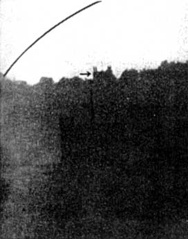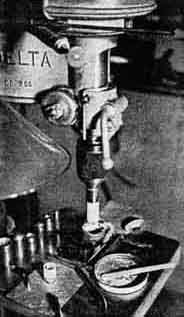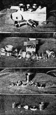Right photo (Eeny): "Templets and tools used in making the lenses for the two eyepieces shown," Taylor states. "Templets were machined to .001" curves on tools are equally accurate. The field lens is of Chance Bros. crown and the smaller lens is a cemented doublet of barium crown and flint. First class performance from both eyepieces." Meeny: "From left to right: A block of glass from which two cylinders have been ground; the trepan that did the grinding; a cylinder of glass 3/4" in dia. x 1-3/32" long, ground out in one hour without forcing; six brass tools for grinding curves, and the finished Hastings type D eyepiece. In the foreground are the precise templets with which to check curves. The background shows a group of drill-rod tools with holder, used for fine thread cutting and work on small parts." Miny: "A 1-1/2'' eyepiece completely disassembled. The 'skirt' is steel (less likely to scratch from brass adapter tube). The four cell parts are of tobin bronze. Smaller lens is a cemented doublet of barium crown and flint." Mo: "A 3/4", type D Hastings eyepiece completely disassembled. The first two parts are the cell which holds the lens. Next is the complete lens, showing the tiny cap lens which is cemented to the small end of the cylinder. Then comes the front or eye end made of tobin bronze, and at right the skirt of steel. All parts are precisely centered." Figure 2, also by Taylor, shows his drill press setup for grinding cylinders from a block of glass. "Note the dam of wax which forms a well to hold the abrasive mixture," he writes. "This arrangement keeps the trepan from overheating, reduces the necessary grinding time to one third, is economical on abrasive and makes a cleanly performance, as can be seen from the photograph. This was taken immediately after releasing the cylinder, and with no cleaning up except to wash the cylinder. The latter shows in the foreground, washed free of the grinding goo. Tools for grinding the curves of a Hastings D type lens are shown lined up, in order to include them in the photograph." IN one chapter of "A.T.M.A." Dall of England describes the construction of a camera obscura, consisting of a movable flat projecting above the roof of a house and feeding downward into an objective lens which throws its image vertically down on a viewing table in an attic. Figure 3 is a terrestrial photograph made through this instrument. "I was trying," Dall writes, "to take an infra-red photo of a little church which stands up in the sky-line 17 miles from here, in Buckinghamshire. I have got best results so far with visible light and a red filter instead, because of the too lengthy exposure with infra-red, also because of enhanced diffraction effect of the longer wave. Infra-red long-distance photography tends to defeat itself, as far as detail is concerned, because of the reduced resolving power of the long wavelength. A 2" telescope will give as good an image at 5000 A.U. (average of spectrum) as a 4" telescope at 10,000 A.U. (infra-red), although the infra-red does penetrate atmospheric haze. Objective diameter 4-1/2", plus eyepiece, plus enlargement. Red screen an Ilford Panchro plate. Exposure 2 minutes (This house won't 'stay put' for a long exposure. A temperature difference of a degree or so will cock the house over enough to give a band image of a line at this big magnification.) at 8 P.M., last July. Beclouded sun immediately above and slightly to right. E.f.l. of final result about 1400" or 115'. The curve drawn on the photo show the size of the setting sun or moon at the same scale. The little drainage trough just visible [It shows on the original but not on the half-tone, hence we added an arrow.--Ed.] sticking out of the distant tower would be about 6 inches across. It is a coincidence that my viewpoint shows two churches, on distant 17 miles, the other 5-1/2 miles, within 1 minute of arc of one another." Foreground objects in Dall's photograph, under-exposed as he explains, are rather dim and the half-tone reproduction renders them still more so. On the original the details of the foreground, consisting of treetops, are visible, and the picture has considerably more life than in the half-tone Any readers of "A.T.M.A." who may be planning camera obscuras will gladly be hooked together by ye scribe if they care to send in their names-a sort of "Camera Obscura Club" would thus be formed. It is also expected that the publication of Haviland's detailed instructions for making objective lenses by something more like professional methods than any instructions previously available, will result in a trend in that direction, as "A.T.M.A." has already reached more than 1200 persons, assuming but one reader to a copy-quite an assumption, for some copies are known to be read by a dozen amateurs. THOSE of us who observe in the East, or even in parts of the West, will envy Clyde W. Tombaugh ("A.T.M A.", page 639) of the Lowell Observatory in Arizona, where seeing is really seeing. He writes: "I have been having some fine views of Venus, Mars, and so on, through my 12". On the 5th of March, during the early twilight of the evening, the seeing was ripping good -No. 8 on a scale of 10 (10 giving a perfect diffraction pattern for a 5" object glass) and I finally put on a power of 742. The image of Venus was huge, perfectly sharp, clear cut, and there was scarcely a quiver. "On the morning of March 11, I had some No. 6-7 seeing with my 12", power 300, and saw the minute northern polar cap (now at minimum size) of Mars well; it was only about 1/2 by 1/4 second of arc, down at the N. limb of the planet. I saw the oasis Isminii Luci, cloud areas, Dawes Forked Bay, Syrtis major, portions of the Protonilus and Deuteronilus "canals", and glimpsed the Hiddekel and Gehon "canals"! The colors of the markings came out beautifully in the morning twilight. At that time, the angle subtended by the disk of Mars was only 9.8 seconds of arc (equal to that of a 3" ball placed a m
