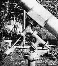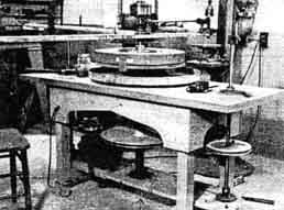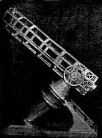 The mirror was made on the machine shown in Figure 4, where the disk, 2-1/2" thick, is shown while being perforated. Central spindle, 3 r.p.m., side cranks 40 r.p.m and 1 r.p.m. Figure 3 shows the preparation of a plaster-backed polishing lap for an f/2.5 sphere for testing the secondary. The lap was made by the Ritchey method-pouring pitch between 1/4" strips of wood laid on newspaper. Cross marks were pushed into the strips before the pitch cooled, and the strips were broken into squares on hardening. The squares were later heated enough to detach the newspaper and applied to the disk, which was already covered with HCF, and others were similarly applied to the main mirror (Figure 5). An excellent method of supporting a mirror for test devised by the late Henry H. Mason of Florida and once illustrated in these columns and used by Jones, is shown in Figure 6. A crank behind the board permits rotation of the spool and belt to bring any diameter of the mirror to a vertical. Jones spent a year planning this telescope, making 15 detailed drawings. To make the main mirror took one month of day and night work. Iron tools were used for grinding. Polishing took 27 hours, figuring 30 hours, and at no time did the mirror misbehave. The secondary is a 5-1/2" convex. FROM Cyril G. Wates, 7718 Jasper Ave., Edmonton, Alberta, Canada, we have received the following item pertaining to the telescope making art: "With the Foucault test nearly eighty years old, it is hardly likely that anything connected with it is actually new, but speaking for myself, there was always something lacking in the precision of the test until I made the discovery that by sliding the knife-edge along the optical axis instead of across it, I could watch the shadows change from right to left, and thus determine the exact focal center of any zone. "In order to slide the knife-edge along the axis with absolute precision an adjustable guide must be provided with means for moving the edge laterally without affecting the parallelism of the guide and the axis. I built a rather elaborate machine with micrometer adjustments, right-angled prism, and so on, but nothing of the sort is really necessary. A strip of wood screwed down to the table, a large block to slide along it, and a knife-edge mounted on this block in such a way that, by turning a screw, the knife can be moved in and out-that is all. The essential point is that the whole thing must be movable exactly along the optical axis. "In actual testing, I start inside the focal center and work toward me, then start outside and work in. I find that there is rarely more than 0.01 of an inch difference, even on central zones. I have completely refigured my 9" mirror, using this method, with the result that I can easily split double stars which were formerly quite hopeless. The whole point of the method is that you watch the shadow continuously and can easily determine the point at which it reverses, while the customary method requires the observer to judge a fixed appearance. It is the same difference as there is between a motion picture and a series of photographs." FOLLOWS a second item by Wates: "The contributions of J. H. Hindle and others in ATMA on the construction of diagonal mirrors for Newtonian telescopes leave little to be desired, but for the benefit of those who, like myself, hesitate to attempt the edging and figuring of an elliptical flat, the following considerations are submitted. "Diagonal mirrors, are generally made either elliptical rectangular. In either case, the blank must be edged to size and then provided with a 'surround' of similar glass before attempting to figure the surface to a true plane. To these shapes may he added a third, viz., circular with straight edges. Let us see what is the loss of light due to the use of each of these shapes; taking a 12" mirror with a focus of 96" as an example. "The correct size for an elliptical diagonal will be 2" by 2.83". The area of parallel rays intercepted will be that of a circle 2" in diameter, or 3.14 sq. inches. Assuming glass 3/8" thick, a rectangular diagonal will intercept a rectangle of rays 2" by 2.3", allowing for the protruding lower edge, which could, of course, be ground off if desired. This area will be 4.60 sq. inches, which is 1.46 sq. inches greater than that of the ellipse. The effective area of the O.G. being 110 sq. inches (approx.), there will a loss of light of about 1.3 percent, which is equal to masking a strip around the edge of the mirror .038" wide-or about 1/32" "How about a circular diagonal? Again following for the squares, the rays intercepted will take the form of an ellipse, 2.83" by 2.30", with an area of 5.11 sq. inches. As compared with the elliptical mirror, this represents a loss of light l.8 percent, equal to a strip .052" wide around the edge of the O.G. As compared with the rectangular diagonal, the circular one causes a loss of light of only 0.5 of 1 percent, or an amount equal to grlh8~away 14thousandths from the edge. "These differences are so small that one is led to the conclusion that the labor involved in constructing a truly elliptical diagonal is sheer waste of energy, and that a circular mirror which can be polished and figured without elaborate complications is perfectly satisfactory in all but very short focus telescopes. Certainly the difference in performance between a 12" mirror and one being a diameter of 11.948" is hardly justification for the work involved." FIVE men in Providence, Rhode Island- Prof. C. H. Smiley, mathematician-astronomer of Brown University, Donald S. Reed, Harry A. MacKnight, Paul Eberhart and Frederick C. Hoffman-have made a 6" Schmidt camera shown in Figure 7. The tube is shown inverted, Hoffman (right) has his thumbs on the mirror cell, his little finger on the film supporting ring, and Eberhart (left) his fingers on the ring for the correcting plate. Figure 8 shows the special machine by which these workers solved the problem of the dif