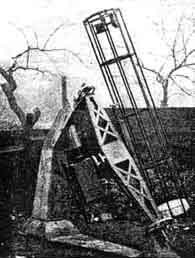 "The main reflector is a 12", f/8 affair. and provision is made for photographing both at primary focus and with a magnifying eyepiece. For photographing star fields we have fitted a camera on the other side of the polar axis, for which we made our own 4", f/6 lens. When the Schmidt we are making is ready we will probably mount it in place of this camera. When photographing with the star field camera we use the 12" reflector as a following telescope, and when photographing with the reflector we use the 4" refractor shown on the photographic attachment. "Our telescope mount is driven by a synchronous motor which in turn is driven from an oscillator. An oscillating valve drives two power valves in push-pull and the output, five watts, is ample to drive the telescope with plenty of reserve power. An H. F. pentode valve oscillating as a Dow oscillator has part of its capacity on the tuned circuit connected to a switch, so that the addition or reduction of capacity varies the frequency of the oscillator and hence the frequency of the supply to the motor. "I have been carrying on some very intensive investigations into stable oscillators and I have utilized the results of this work when designing my own oscillator for the telescope drive. This oscillator, going off at 50 cycles, will remain constant in frequency to about 0.05 percent during an evening's run of several hours. This actual drift is negligible compared with errors due to refraction in the atmosphere and, as the speed of the motor is hand controlled, the small but steady drifts can be taken care of. The variation in capacity is by means of a two-flick switch held in the hand at the end of a flexible shielded lead, and being small and worked with a flick of a finger, it is really very nice to handle. We have had this control in operation for about 15 months and have never had the slightest bit of trouble with it." The two Coxes wish to get in touch with American amateurs. They are making a variety of things, including a Schmidt camera, an aluminizing outfit, and an automatic guiding rig. They have just finished an observatory for the telescope shown in Figure 1 and, with a diameter of 10', this has a slot that can be opened to 66" because of the spread of their camera and telescope. IN Figure 2 is another Briton's telescope, the maker of the optics in it being Horace E. Dall, 166 Stockingstone Road, Luton. Bedfordshire, England. Dall is the author of two chapters in ATMA and his vocation is research and design for a firm that manufactures industrial measuring and controlling instruments, particularly for water, steam, gas, air, oil, and other fluid flow. Someone nicknamed the 'scope the "jack-knife" telescope and it apparently stuck. Dall writes: "It's not everybody's luck to possess a first-class astronomical object glass of large aperture, but possession of the O.G. is only part of the battle. The usual focal length is anything from 13 to 17 diameters and the rigid mounting of such a long telescope on a stand tall enough to give comfortable vision at the eye end is no light job. "Captain M. A. Ainslie, of Bournemouth, England, possessed an 8-1/2" object glass of 10' focus, and having decided that the ordinary long tube mounting was too cumbersome to consider, schemed out a system of folding which better than halves the length and gives far more comfortable vision-even than a standard refractor fitted with star diagonal. "Only one additional reflection is needed, in comparison with the latter, and the final image has the advantage of normal astronomical inversion, while the eye tube can be swung round to suit any chosen angle of view either for comfort or orientation of image (see end elevation). It will be seen that the center of gravity of the system comes fairly near to the eyepiece mount. This adds further to the comfort by reducing the range of movement of the eyepiece. "The illustration shows the details of the sturdy portable form of equatorial mounting adopted-with slow motion and circles. A long dew cap is fitted to the O.G. and the whole tube is of wood and covered with zinc for working in the open. Mr. Perry (Figure 2, left) of Luton built the entire stand and tube, while the optical items and most of the instrument work were by my self. The instrument is now in regular use (mostly on planetary work) by Captain Ainslie (at right in Figure 2), who is one of England's most prominent amateur astronomers. He also possesses a reflector of larger aperture (9") made by himself many years ago, and the use of the two instruments side by side entirely confirms the well-recognized fact that a refractor (folded or not) gives much steadier images than a reflector though on comparatively rare occasions the latter shows to advantage." THIRD of these three overseas items is a communication from W. H. Haase Kramatlaan 22, Batavia-Centrum, Netherlands East Indies, who says that, 30 years ago in Holland, he made a simple telescope and that he now has a medium-sized refractor. His comments are: "In ATM, as a fit instrument for amateurs you put the Newtonian reflector well to the front; the Cassegranian and Gregorian come respectively second and third. As to the Herschelian, your remark on page 449 that it is favored by few and you give the reasons why. Anybody having practical experience with the instruments will agree with the order of use as given by you. Yet there exists or has existed a fifth possibility, a handy combination of the Herschelian and the Cassegranian, which is not mentioned in ATM. I enclose a sketch of the principle (Figure 3). "This combination was constructed around 1900 by K. Fritsch of Vienna and its principal advantages are the total elimination of obstructions from the field of the primary and the fact that no perforation of the latter is needed-certainly no negligible point when compared with the dimensions of the secondaries in the tubes of the Cassegranian and the Gregorian reflectors. If the 'brachyte' (the comb
