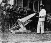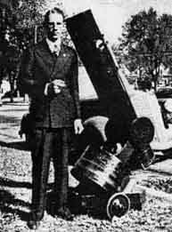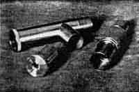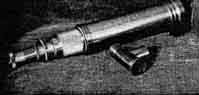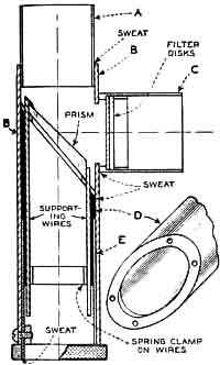 Figure 1 is an 8-1/2", f/6 reflector made by Harvey H. Boven, 304 Seventh St., Red Wing, Minn. Tube, galvanized iron. Cell, a Chevrolet hub crown filled with lead (for counterweight). P.A. bearing, an 18-1/2," split wooden pulley on two non-bearing 3" brass rolls "which give me all the friction needed," the maker states. This brings up the fact that too little friction may be a won t stay-put nuisance unless there is perfect balancing and a clamp. Boven also invites correspondence. Figure 2 is a 7-1/4" f/8 made by Alfred Bryant, 516 Egleston St., Kalamazoo, Mich. His P.A. bearing is an old gasoline engine flywheel and the P.A. shaft is l-3/4" in diameter. To it is attached the gearing of an old phonograph motor with an extension hand rod which is used as a slow motion. Base of fork, heavy washing-machine casting. Sides, boiler-plate. Tube, 17 pounds, 3/8'' thick, spirally wound paper with five coats of paint, "strong enough to hold an elephant." Figure 3 was made by L. H. Strum, 232 First St., Petersburg. Fla., and has a 15" mirror. The P.A. bearing is braced with four struts. FOR solar, and often for lunar, observation a telescope often needs some kind of light and heat reducer. In the following paragraphs D. Everett Taylor, 191 Prospect St., Willimantic, Conn., author of the ATMA chapter on the construction of the metal parts and mounting of a refractor, also of various items previously published in the present columns, and always a finished worker, tells how to make a Herschel wedge. "In 'Amateur Telescope Making', third edition, page 147, and fourth edition, page 179," Taylor says, "the late Prof. Charles S. Hastings closes his chapter on astronomical oculars, with the following paragraph: 'I venture to add the following, under the impression that the Herschel wedge is not nearly as much used as it should be. With it Venus, so unsatisfactory an object in a dark, or darkening sky, is a delightful study. Then the moon, also, except when a rather slender crescent, is much pleasanter to view with this accessory. Ordinarily this object is so brilliant that the pupil of the eye is contracted so that only part, perhaps a small part, of the objective is effective, which may he the cause of a prevalent impression that the moon is too easy an object to afford a test for the excellence of a telescope.' "Bell, in 'The Telescope,' page 166, briefly describes the solar diagonal devised by Sir John Herschel. He shows a schematic plan of this solar diagonal or Herschel wedge and says, 'In viewing the sun only about 5% of the light (and heat) is reflected at this upper surface to form the image at the eyepiece.' On an adjacent page, in describing a star diagonal, Bell also says, 'The right angled prism is replaced by a simple elliptical prism of small angle, 10 degrees or less, with its upper face accurately plane and at 45 degrees to the axes of the tubes.' "The above quotations comprise all the published data known to this writer. Albert G. Ingalls states that he knows of no other literature on the subject, aside from the references here given. "A Herschel wedge is a most satisfactory accessory and, if constructed after the accompanying drawings, without sacrificing any of the required accuracy, the result will be most gratifying and the performance will leave nothing to be desired. Like the star diagonal, the Herschel wedge is especially suited to and indicated for the refractor. There is, however, no reason why it cannot be used successfully on a reflector-in which case the position of the eyepiece would be changed, and the normal focal and tube lengths of the reflector should permit of being shortened the three or less inches which the light travels through the accessory. There is no appreciable heat from the Herschel wedge when viewing the sun-in fact, with it there is no difference in comfort between sun gazing and star gazing. Attention is called to the glass filter disks (Figure 4). These are used when viewing the sun but are removed from the tube when the wedge is used for viewing the moon, Venus, or the landscape during daylight. The latter is an interesting pastime because of the views one enjoys, especially of trees and their foliage. "When using the conventional methods, in photographing the sun and sunspots, the work must be hurried because so much heat is generated at or near the focus that a camera shutter which is not of metal is likely to be damaged or destroyed, but by using the Herschel wedge with its filter disks removed there is no necessity for hurrying the work, because the heat is so completely dissipated that this question is no longer a consideration. "The following notes on construction describe materials and practices used in making the Herschel wedge shown in the drawing, Figure 4. "Stock: Brass throughout, except the glass wedge or prism. Tubes machined from suitable sizes of brass pipe. "Prism: Made from plate glass 1/4" to 5/16" thick. Angle of finished wedge to be 8 to 10 degrees. Upper surface which reflects the image, if plane to 1/2 wavelength is of acceptable quality; 1/4 wavelength however, is better but is sufficiently good. The prism was cut to its cylindrical shape, which looks elliptical, by the method described by Selby, page 126, AT\IA. "Construction: The surfaces between parts A and B were first machined to a fit, the then contacting surfaces were carefully tinned and the parts joined by sweating, which after the standard eyepiece O.D. of 1-1/4" was machined on part A. The circular intersection on the end of part C was machined to fit the circumference of part B. It is a safe practice to fill part C, before machining the curve, with a turned hard wood mandrel, which will support the wall of the brass pipe when the latter is clamped in a two-jaw chuck. The next step is to bore the inside diameter of part C to a shoulder which will support the filter disks: The internal diameter of C should be the standard 1-1/4" for a standard size of eyepiece. Locate and