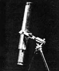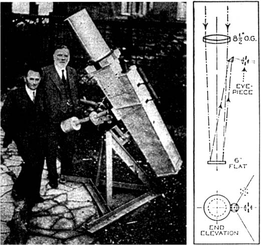 "It has occurred to me that some further remarks concerning the instrument-which has now been in regular use for two years-might be of some interest to your readers. As shown in your photo, the triangle which forms the base of the mounting stands clear of the ground; this was soon found to cause some inconvenience, as well as to make the eyepiece rather inaccessible in some positions; so the triangle has been sunk 6" in the ground with great advantage. At the greatest northern declination (about 43 degrees north) which permits of the telescope passing the meridian without reversal, the lower end of the tube just swings clear of the ground, while the eyepiece is always readily accessible. In respect of convenience of working, the instrument equals, if it does not surpass, a reflector with rotating tube; and the optical parts, once adjusted, are so stable that finding objects by the circles is an easy matter. This is just as well, since it has not, as yet, been found easy to mount the finder so as to be easily accessible in all positions; the arrangement shown in the photo is probably about the best, but is not very satisfactory; however, since the finder is hardly ever used, this does not matter very much. The 'swiveling' arrangement for the eyetube, giving a side-to-side range of some 225 degrees, has been found very advantageous- especially for work on variable stars-as the orientation of the field of view is always under control. "Of course, with two reflections between the object glass and the eyepiece, some loss of light is bound to occur; assuming 87 percent for the reflectivity of the aluminized 6" flat, and the same figure for the prism, the effective aperture of the object glass is about 8.4" x 0.87, or about 7.3"; this gives ample light for such powers as can usefully be employed on Jupiter; while I find that my not very sensitive eye can just see steadily a star of magnitude 13.7 on a good night, so that there is sufficient light for observation of pretty faint variables. "The circles, which are divided only to half degrees and read by simple pointers, bring any desired object into the field of a low power eyepiece giving x 60 and a field of 43'; and the remarkable stability of the whole stand goes a long way toward making 'setting' easy and certain; repeated tests on the Pole Star have failed to show any appreciable movement in the polar axis. "I venture to think that anyone possessing an object glass of similar, or even greater aperture, might do worse than consider the possibilities of this form of mounting, especially for prolonged observation of such an object as a planet." The photograph reveals less distinctly than the drawing the position of the eyepiece, the latter being foreshortened in the photograph. Commenting on this, Horace E. Dall, of Luton, Beds., England, who made the optics (the mounting was made by Perry, also shown in the photograph) states: "The whole point of that extra reflection is accessibility of eyepiece and orientation of image. The Captain is keen on planetary work, in estimating position angles of Jovian spots, and so on. He prefers to set the belts horizontal, which is easily done by swinging the short, projecting eyepiece tube 'round," So far as is known, no American amateur has yet made a reflex-or "euphonium." BECAUSE glass, such as that from which mirror blanks for reflecting telescopes are made, is cooled rapidly on the outside after it is poured, stresses due to unequal contraction are set up in it. Annealing in a lehr is supposed to ease off these internal stresses but does not always do so. Later, when the telescoptician removes glass from parts of the disk, these stresses (for some unknown reason called "strain" by the optical industry) are able to warp the disk out of shape, and then there is grating and gnashing of teeth, for the disk is probably a candidate for the discard. Last April, H. E. Dall, of England told in these columns how he had designed and built an inexpensive tester for strain in glass, making use of the new polarizing material, Polaroid. This tester, he stated, consisted of ( 1 ) a lamp in a blackened box having an opening covered with Polaroid; (2) a ground glass screen; (3) Polaroid goggles worn by the viewer. He added that this simple equipment "showed up strains so brilliantly that there was no need even to test in a darkened room, subdued light sufficing to permit the indications to reveal themselves." F. M. Garland, 1006 Davis Ave., Pittsburgh, Pa., read this note, obtained a few more details from England and built a Dall tester. He now writes: "Scanlon and I tested all the glass within reach at the Valley View Observatory with it and the set-up really works." Therefore we have obtained from Garland some of the details. Starting at the lower, left-hand corner of the photograph (Figure 2) the following elements of the set-up are seen: (1) A wooden box, hinged beneath for adjustment in altitude and containing an ordinary 25-watt lamp. Fastened over the hole in its front this hole being made as large as the polarizing material will permit, is one half of a pair of Polaroid goggles of the kind now obtainable at many filling stations, with their normally horizontal dimension vertical. (2) An easel with a pane of common window glass frosted on one side, to provide a fairly uniformly illuminated area of polarized light large enough to permit the examination of a moderate sized disk against it. (3) The glass under test, held in the hands. If the glass is not strained, the expansion due to the heat of the hands will give it a strain, hence it should be insulated with a cloth or felt; but if the desire is to study the effect of heat in causing temporary strains, no insulator should be used. (4) A pair of Polaroid goggles worn in the normal manner, which will use the horizontal dimension of the lenses to cross that of the Polaroid in the lamp box and thus be at right angles to one another. (5) The eyes of the tester-in Figu