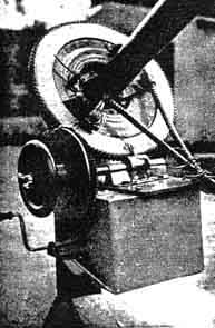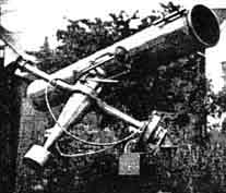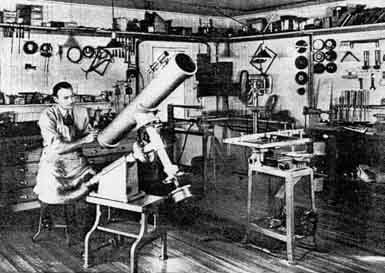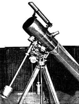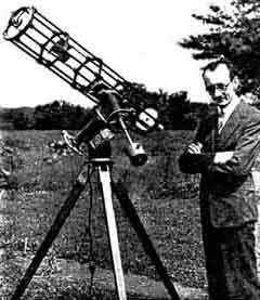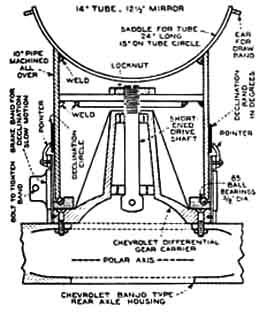 Finished is the word for the 6" portable 'scope shown in Figure l, made by Emir Kelley, of South Brownsville in the southwestern corner of Pennsylvania. All its parts are of instrument maker grade of workmanship, as the photograph shows. A Hindle "crocodile-type" grinding machine ("ATM," 4th ed., p. 235), also made by Kelley, is equally finished in appearance and its description will be published at some later date. Kelley's telescope has an eyepiece adapter that rotates 90 degrees over the top of the tube in a transverse slot. It also has a weight-driven clock that will run 3-1/2 hours with one setting. We detailed one of our super sleuths to dig up more data about Kelley, as we suspected him of being something of an inventive genius, and this secret operative reports that he is the senior partner of Kelley and Stewart, makers of auto jacks and cranes; also that he owns a famous grandfather clock of his own design and make, which not only tells the time and the moon's phases, but is a true Gentleman's Annual Best Friend and Life Preserver. Almost any married man will recall the awful feeling experienced when, one day of the year and generally along toward bedtime, his wife hands him a calendar and stands waiting before him with lips tight drawn; whereupon he is at first puzzled, then leaps suddenly from his chair, passes a trembling hand across a flushed brow and begins thinking fast for alibis. Once more, doggone it, he has forgotten his wife's wedding anniversary! And now it is too late-too late! To Kelley, however, nothing like this ever happens, for on that date, once each year, the good old grandfather clock he devised raises a small flag on a miniature flagpole and blows a whistle (Esquire please copy). Kelley then dashes downtown and buys flowers. The design in Figure 2 seems almost ideal. It is a 6" Cassegrainian Gregorian combination made by Roy E. McAdams, a designer and builder of miniature gasoline engines, according to his letterhead, and situated at 2155 S. Limestone St., Springfield, Ohio. "Time consumed for making patterns, machining castings (which are of aluminum alloy) and grinding and polishing optical surfaces was approximately 8 months' spare time work," he writes. "The main mirror is 30" in f.l. and the Gregorian combination has an amplifying ratio of 6. Despite the fact that its accuracy is excellent, it is used but little." [The present year is the 300th anniversary of James Gregory's birth.-Ed.] "The clock drive consists of synchronous motors and a train of gears which give sidereal time to a minute fraction of a second for a run of 24 hours." The axes of the McAdams telescope have the cross-section urged by R. W. Porter in "ATM," and the plate attaching the declination axis to the tube is also a thick, heavy one. When mounted on a fixed base this 'scope should be rock-solid. The tube is a piece of engineering design, and the whole is also "easy to look at"-a factor not always combined with good engineering design, just as good engineering design is not always ideally combined with "easy to look at. '' The third well designed telescope is shown in Figure 3 and is commendable for great rigidity. The maker of the mounting, William W. Maxwell, 1018 S. Franklin St., Mt. Pleasant, Mich., whose letterhead indicates that he runs an electric and ox-acetylene welding establishment, has really gone as far as Porter urges in "ATM" (4th ed.) in the direction of that desirable quality-something that few of the telescopes made by amateurs (and professionals) exhibit. This telescope was built as a memorial to the late William Tyler Olcott, for the Daytona Beach Star Gazers' Club, and is to be set up at Daytona Beach, Fla. The piers shown in Figure 3 are merely temporary rough ones of wood. Concrete piers are to be built. Most of the details are best explained in Figure 4, which is well worth stopping to study at this point. The bearing of the tube is of the full three point type with really wide spread, and the mounting is as stiff as a mountain. The counterweight tube, shown in Figure 3, is a piece of galvanized steel bent to form a 20-sided figure. At the lower end of the polar axis shaft is a 120-tooth starter ring-gear (Figure 5) welded to the edge of the brake drum. The drive is a large hand-cranked phonograph motor and will run for 35 minutes. There are setting circles on both axes and the slow motions operate from the eyepiece neighborhood by way of flexible shafts. The mirror was made by R. E. Stevens, 500 S. Ridgewood Ave., Daytona Beach, Fla., and is of Pyrex. "Yours for bigger and better bottlenecks, Maxwell signs his data letter. Proportionately this mounting has the biggest bottleneck we recall seeing, outside of Porter g mounting for the 18" Schmidt at Palomar ("ATMA," p. 398). PEOPLE, themselves, are fully as interesting as telescopes. The following notes attempt to snoop a bit into the private lives of some of the authors of 'ATMA," also some amateur telescope makers who seem to have burst right into professional optics. It has turned out that among the authors of "ATMA" there was an unsuspected moving picture actor. "I presume you know," Capt. M. A. Ainslie of England (himself a capable mirror maker-"ATM," p. 100) tells us, "that the W. T. Hay, F.R.A.S., who writes on a 'Simple Chronograph' in 'ATMA' is better known as Will Hay, the comedian film star." Later, H. E. I Dall sent us an English newspaper from which the advertisement shown in Figure 6 is re- . produced. He states that a few years ago Hay "was in all the newspapers as discoverer of a new big white spot on Saturn, soon afterward was elected a fellow of the Royal Astronomical Society and then published a book called 'Through Thy Telescope."' We find that this same book was reviewed in our June 1936 issue, before we knew Hay's identity. Hay lives at Hendon and owns a 6" refractor. D. Everett Taylor, author of the chapter on "The Refractor-Metal Parts and Mounting," in "ATMA," before his recent retire