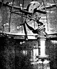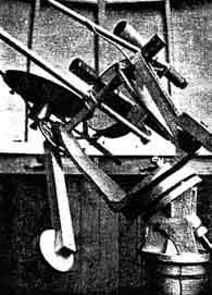 "Enclosed are photos of my weird-looking 15-1/2" 'modified' Cassegrain telescope-'tubeless' yet framed by steel tubes. It has turned out to be optically entirely satisfactory and will do all that a l5-1/2" can do, and that at a most comfortable manner. It is modified not alone in respect to the spherical secondary-this is the least important modification. You will recall that I described briefly the main features of the proposed modification in a letter to you early in 1932, also in the Journal of the British Astronomical Association, May, 1932, and for convenience I repeat the description. "Mainly, it consists in the introduction of a high-grade intermediate lens (erecting lens if you like) between the secondary mirror 1, Figure 1 and the final image. For convenience, compactness and so on, this lens is supported by a tube 2, through the primary perforation. The benefits resulting from the addition of this lens are very great and lie in many directions. "(1) It enables the sky-flooding diaphragm to be moved from the eyepoint (where it is nothing but an infernal nuisance, has to be fitted to each eyepiece, and is almost impossible to keep in good adjustment because of its minute aperture) to a position between erecting lens and eyepiece where it is quite out of the way. It has a large aperture and always keeps in optical alinement. This permits: "(2) Wide-field eyepieces with comfortable eyepoint, greatly appreciated by spectacled observers. "(3) A good iris diaphragm to be used for the sky stop just described, so that the aperture of the telescope can be varied by a small index lever (as in the case of my 15-1/2,") from full aperture down to nothing. This can be operated while actually observing. "(4) Location of the erecting lens between the mirrors enables the long focus of the normal Cassegrain to be shortened down to a very convenient length-an important feature of this 15-1/2". I can secure the advantages of variability of the distance between lens and secondary and lens and eyepiece, giving me: "(5) A final image varying in angular aperture from f/10.5 to f/26. This enables me to get a continuously variable power over a range of 1 : 2-1/2 from each eyepiece. "(6) To accommodate any small thermal variations of spherical aberration of the primary by opposing the aberration introduced by varying the 'tube length' from the mean position for which aberrations are nil. "(7) It erects the final image, permitting excellent terrestrial views of great brilliance and completely free from any sky-flooding troubles. I have a fine outlook, terrestrially. From my observatory and find I can take full advantage of this unusual terrestrial aperture at all steady air periods, evening and morning, when air clarity is reasonable. "In the case of the 15-1/2" my erecting lens is 2-3/4" in aperture and enables me to have an eyepiece, 3, of lowest power (X60) of real RFT character, which will include the whole Moon and a large margin to spare. This is probably unheard of in a 15-1/2" ordinary Cassegrain and I get it with a central obstruction of only 20 percent of the primary diameter (4 percent of the light). "The fully illuminated field is about 0.3 degrees, but cut-off noticeable at the edge of the low-power eyepieces. In order to get this, of course, the erecting lens is somewhat difficult and took me longer to make than the primary. Good corrections are obtained by cemented triplet construction and the residual secondary spectrum in the final image is quite negligible and visible only to a practiced eye. "I calculated the eccentricity of the ellipsoidal primary and did the final figuring with the pinhole at near focus and the k-e at remote focus, some 120' away, the whole being quite convenient and easy. This method is the one I have always used for my spherical secondary Cassegrains. "The driving clock, 4, is a Synclock weighing little more than l/2 pound all told. and giving ample power even when I am pulling the telescope backward against the independent friction drive (between the polar axis trunnions, 5, 5, and the worm wheel) . "One great advantage of such a small motor-probably the smallest ever attempted for this aperture telescope-is that there are only one or two watts of heat to dissipate and the chance of warm air trouble in the observatory is thereby very much reduced. "I had intended to put a pair of deflector sheets V-fashion below the optical cones to guide any rising warm air out of the optical paths, but have not yet done so-the need is not extreme, but I think it is desirable. I am certainly not troubled wit tube currents, and it seems to me when comparing performance with my earlier 14", open-air, square wooden-tube reflector that I am decidedly better off now. The observatory, shielding the instrument from rapid radiation, helps a lot, despite statements I have sometimes beard to the contrary. The observatory is aluminum painted to retard rapid changes of temperature due to radiation, as per my British Astronomical Association Journal article of January. 1938. "Focusing is done principally with the little handwheel, 6, and extension shaft which moves the secondary, although additional spiral sleeve focusing can be done at the eyepiece end. "The mirror lid is hinged and fastens back on the framework where it is out of the way (shown better in Figure 2). "To save making up a new stand, all the lower part, 7, is an old Calver equatorial stand (date 1882). It originally carried an 8-1/2" mirror in iron tube between the trunnions but, as I couldn't get a 15-1/2" between the same trunnions, I carried it outside and put lead balance weights, 8, 8, on the other side. The overhang is thus more than one would use from unfettered choice, but the whole system is very light-much lighter than the original 8-1/2" Calver. I have added worm drives on the two axes, but I have yet to add circles and a few other improvements. "The finder, 9, is 3" in aperture and the power 10X with an actual field o