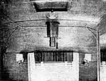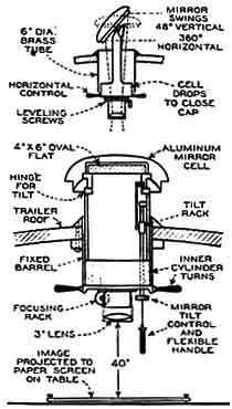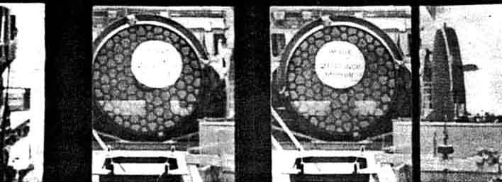 "The present figure of the 200" mirror approximates closely that of a sphere with a radius of curvature of 111 feet. The disk was first shaped on front, back, and edges by grinding with coarse Carborundum and the center was then hollowed out to a depth of about 3-1/4" with the aid, first of a 50" tool, and then of successively larger tools up to the full size of 200". As the spherical figure was approached, finer grades of Carborundum were used, so that when optical tests became necessary only a few hours of polishing were needed to give the surface sufficient reflecting power. During the first stages of work upon the disk, the cylindrical holes on the back of the mirror and the large areas between the supporting ribs were filled with plaster of Paris, and after the face and back had been made parallel the 40" opening at the center of the disk was closed with a glass plug weighing about one ton. The plaster of Paris was removed when the surface had reached nearly the required form, and the mirror was placed upon rubber pads which rest on the frame of the support system of multiple counterweighted levers. The friction of these pads was required to neutralize the strong lateral pull of the grinding and polishing tools making contact over so large a surface, and for this reason the horizontal plates of the supporting system were not engaged. The optical tests, however, were made with the mirror vertical and balanced upon the support system just as it will be when in use on the telescope. Future optical work, including the parabolizing, will be carried on with the mirror resting upon the rubber pads; but these will be removed when the figuring is completed. "From the first the optical tests of the mirror proved to be most satisfactory. No change was seen in the figure when the mirror was tipped repeatedly from a horizontal to a vertical position or when it was rotated. Also no local deformations could be detected at the points of contact of the 36 individual lever supports. In fact, the support system was found to be performing quite as well as had been hoped by its designers. The length of the radius of curvature proved to be about 2" less than had originally been planned, but this slight difference, amounting to about l" in the focal length, is far within the limits allowed for in the design of the telescope, and it is probable that no attempt will be made to reduce the amount through polishing. The surface was found to be reasonably free from zones, but a small amount of astigmatism was present amounting to about 0.1" in the optical cut-off at the center of curvature. This proved to be due to a slight deformation of the disk caused by the horizontal pads upon which the mirror rests. [Supplementary note added in letter from Dr. Adams to Scientific American, to bring article up to a later date: "Through suitable changes in the supporting pads this astigmatism has now (March 15) been eliminated by a small amount of fine grinding and polishing. The zones have also been considerably reduced and the entire mirror surface is nearing an accurate spherical figure. Work will soon be commenced upon the final figuring of the 120" plane mirror to be used in testing the parabolization of the 200" surface.''] "Although the final parabolic curve of the surface of the mirror will be only 0.005" deeper than the spherical curve, the area is so great and the process of polishing so slow that it is planned to make most of the change through fine grinding and to leave but the final stages of the figuring to the polishing tool. This procedure has already been found successful in figuring the spherical curve. "Accurate tests of the parabolic figure of the 200" mirror will require the use, as an auxiliary plane, of the 120" mirror. The completion of this mirror will be one of the next major undertakings in the optical shop. It is at present shaped on front, back, and edges, and the surface has been ground approximately flat. It is planned to figure the three auxiliary hyperbolic mirrors, one for the Cassegrainian and two for the coudé combination, by the method devised by Hindle, without the use of the 200'' mirror. Four spherical mirrors, each about 40" in diameter and with a radius of curvature of 25', are being prepared for this purpose, two being very nearly completed. The mirrors will be used side by side in a cloverleaf pattern and provided with adjustments for bringing their centers of curvature into accurate coincidence. "A few figures are of interest as indicating the scale of the optical work on the 200" mirror. About five tons of glass have been removed in the process of shaping and figuring, and about 20 tons of Carborundum have been used for grinding. During the polishing, about 50 pounds of rouge an hour is the average consumption with the full-sized tool, and but a small fraction of this material can be salvaged. As a result, rouge has been purchased in quantities hitherto quite unfamiliar to dealers in optical supplies." IF you can train your eyes to perform suitably, you can superpose the two images shown in Figure 1 and obtain a three-dimensional view of the 200" mirror and of the lettered image. You are standing in the lofty visitors gallery in the Optical Shop at the California Institute of Technology, in Pasadena, California, looking through the windows that divide the gallery from the room in which the big mirror lens," as newspaper writers still call it) is being completed. Axis of the mirror is about 2' below your floor level. About 6' below that, there is a kind of super-pinhole about a foot in diameter, with a lettered transparency over it and a powerful light source behind it. The rays go to the mirror and are reflected back to a focus about 6' above the axis, at your approximate eye level and 2' or so in front of the window. In Russell Porter's words, "you'd swear the image was material. Startling! " It seems to hang in space and you feel the urge to feel of it, others comment. Thus f