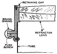 In Figure 1 is an 8" refractor made by H. P. Garrison, R.F.D. 1, Oceanside, Calif., working from the very detailed instructions by Haviland in "ATMA", the companion volume to "Amateur Telescope Making". "The objective lens," Garrison writes, "was made from a pair of Chance Brothers hard crown and dense flint, ground to a focal length of 134", or f/16.75. I spent much time regrinding and polishing five times, but I did not mind that because I was learning all the time. Now I have a lens that will stand 75 diameters' magnification to the aperture inch when the seeing is good, and I feel I am very well repaid for the extra work. "The mounting is made from Chevrolet truck parts, steel pipe, and boiler plate, and the axes are mounted on ball bearings. The tube is of 20-gage galvanized iron 8-1/2" in diameter. "The mounting works very smoothly but, in the wind, as shown in the illustration, taken before a 14' by 14' roofless observatory with 6' walls was erected, it was very shaky. "The cell, Figure 2, is made of aluminum cast in one piece, and is held in place by means of brass clips. This permits removal of the lens without disturbing the adjustment." FRAMED attractively in the twigs of a neighboring tree, as shown in Figure 3 stands the huge, 137' dome for the 200" telescope, atop Mt. Palomar, California, with the great mounting inside practically ready to receive the big mirror next year. This artistic photograph was taken by Ted Watterson, official photographer at Mt. Palomar. Figure 4 is a 1/340-scale replica of the same great dome, cast in brass and aluminum by Fred Ferson, 404 Reynoir St., Biloxi, Miss., author of the chapter on molding and casting in "ATMA". The patterns were made by Russell W. Porter and presented to Ferson, a friend. Ferson then poured the castings, machined them, and finished them to a degree of neatness that makes of this replica a most attractive desk, or other, ornament-suitable also for adaptation as a cigaret humidor, ash receiver, or other utility. Ferson hopes to install in some of these replicas a model of the 200" telescope itself, if there is enough demand. The base is 8-1/2" in diameter, is made of brass, weighs about six pounds and is lettered "Two-hundred Inch Telescope Observatory A.D. 1940." This brass base includes an integral standing collar part reaching upward as far as the bead seen above the entrance doorway. The upper portion is cast in aluminum, contrasting attractively in hue with the brass base, and consists of a hollow spherical dome 5-5/8" in diameter, to which an accurate replica of the shutters is attached fixedly. This upper portion may be rotated, as on the original, also lifted off to get at the interior, which is machine-finished. Sharp-eyed comparisons will reveal that the entrance door in Figure 2 differs from that in Figure 3, the original. These, however, are different doors and on different sides, the door in the replica being the huge one for the introduction of the big mirror and the other merely for the introduction of the astronomers. In Figure 5 are two lesser items cast by casting-enthusiast Ferson The larger is a 34-ounce brass plaque, 5" by 3/8", made from a pattern by Porter who, when visiting at Ferson's home, poured plaster of Paris into a metal ring and with his jack knife quickly whittled in bas relief in the soft plaster the cartoon of the "Mirror Maker" sweating and straining at his work of preliminary polishing. The smaller piece (32 ounces) is a brass "Telescope Nut" peering into an eyepiece from an awkward seated position, and was cast by Ferson from a pine pattern whittled out by Porter. The two photographs on page 337 of "ATMA" show Ferson with Porter smiling at the camera. STELLAFANE'S annual convention or informal get together of amateur telescope makers and astronomers will be held atop Mt. Porter, near Springfield, southeastern Vermont, on Saturday, July 22. All having interest in astronomy or telescopes may come freely and bring families, friends. They will find about 200 others similarly afflicted (that is, telescopitis, families) siting on grass or hard outcrops of Vermont Jurassic schists ready to swap chin music about telescoptics from noon to six. Then comes supper en masse in a big circus tent (about a dollar). At dusk, reports and speeches by amateurs from hither and yon begin and wear on till all are unconscious: following which those who revive may stay all night, using Stellafane's telescopes and those brought by visitors-bring yours. Good parking. Places to camp. Bubbling spring. Scenery. Air. Not a mosquito. IN February 1938, in these pages Clyde Tombaugh of Lowell Observatory, described his sun telescope: a 12" mirror, unsilvered, a right-angled prism with diagonal face turned directly toward the mirror, thus diverting some 93 percent of the light away through the other faces, and a pair of smoked glasses worn by the observer-the overall reduction in these three cutting the solar light to 1/7500 strength and thus permitting comfortable study of the solar surface. In April of the same year, D. Everett Taylor told how to make a Herschel wedge of the general kind described by Bell, in "The Telescope," for use on Sun, Moon, and Venus, this being an attachment between telescope and eyepiece designed to divert or throw away 90 percent of the light by means of a thin, wedge-shaped elliptical 8 or 10 degree, plate glass prism. Alan Gee, "ATMA" p. 320, a cadet at the United States Military Academy, West Point, N. Y., in rummaging round the previously unused but recently rehabilitated observatory there, ran across the item shown in Figure 6, an old polarizing diagonal of considerable value, and at our invitation he describes it as follows: "A diagonal employing the principle of polarization by reflection to cut the Sun light and heat down to a minimum without cutting the aperture (see Bell, "The Telescope,' pp. 167-8) gives beautiful colored views of the Sun. The following is a description of such a 