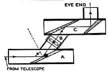 of refraction of the glass used. The equation, tangent "Silvered surfaces or the like will not polarize by reflection, although colored glass will. Black glass can be used in place of wedge prisms if available, but should be used with the third wedge of clear glass to discard extra heat. The new polarizing materials now on the market, usually consisting of thin sheets that polarize by transmission, are not suitable for a diagonal. They pass the violet and deep red (and most of the heat) even when set for extinction, and thus are but little superior to any colored filter. Nicol prisms will work if available but are far too expensive. "The biggest advantage of this type of diagonal lies in the fact that it cuts down the light (and heat) without cutting the aperture and without coloring the image. No colored glasses are needed. The Sun appears perfectly white and can be rigidly controlled in brilliance simply by rotating one tube with respect to the other. The difficulties of construction should not be great, the optical surfaces representing most of the work. If used on a reflector one of the wedges mounted at the required angle could well replace the main diagonal, the other being mounted before the eyepiece. The beautiful views that such a set-up gives of the 'rice grains', spots, and faculae on the Sun surely make it worth considering."