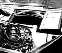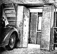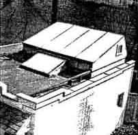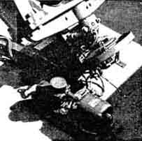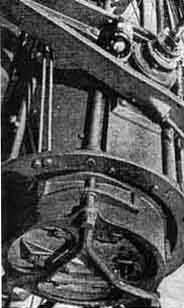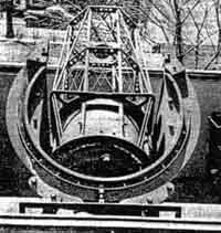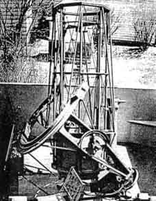 "Your letter," he replied, "puffed me up a bit and, if I do any bragging, it's your responsibility. I started telescope building about three years ago, using a borrowed copy of the first edition of 'Amateur Telescope Making.' "That's when my trouble started, and haven't been the same since. After making the two smaller instruments I obtained a 21'' Pyrex disk weighing 100 pounds and, at the end of about 40 hours work, I had it roughed out to f/5. Fine grinding took six hours polishing nine. This was all done by hand, the 100-pound mirror face down over a full-sized tool and polisher, and I would not advise any one to attempt this unless he has an elephantine physique. [A. W. Everest also did this.-Ed.] "Figuring was done with small tools, mirror face-up. The correction is within 1.5 percent of a full paraboloid and the figure is smooth and regular, the performance good. "Both the convex secondary and the diagonal flat are of Pyrex, I turned down 8" disks to 6-l/2" to gain extra thickness. In correcting the convex I used Hindle's method, and a sphere to figure the flat. "Hindle's 18-point flotation system (Figure 4) was also used to support the mirror, though I doubled its number of inner edge supports. Figure 4 also shows the outer edge support shoes. The cell is a combination of steel plate and castings, welded, as is the lower part of the tube. "The lattice-type tube (Figures 1 2, 3) is bolted to the solid part. Its eight pieces of tubing are of 1-1/4" diameter, 20-gage wall, cold-rolled steel. The 3/16" tie rods and the perforated octagon hoops also are cold-rolled steel, the latter (Figure 3) being made of 16-gage channels. A 1-1/4" washer was brazed into each corner of the octagon and the tubes were then pressed through these holes and brazed, making a very stiff job regardless of the angle at which the tube rests. Figure 2 best shows the pairs of additional tube braces stretched over the squared ring at the top of the solid part of the tube. These give added rigidity. I can detect no flexure by visual inspection of the mirror reflections. "For the spiders (Figures 3 and 5) to support the secondary mirrors I used saw blade steel. "The declination axis trunnions (Figures 1, 6, 7) are castings of special material, (cast iron, nickel steel), as are the four other large parts of the mounting. All were normalized before machining. I made my own patterns. "As I own no lathe or drill press I was forced to have the lathe and similar work done outside. "The declination bearings are used truck ball bearings (radial thrust, 5" O.D.) They had to be large because the trunnions were to be hollow to allow the reflected rays to pass through to the eyepieces. "I placed the declination circle with its shielded light (Figure 6) on the west side. It is divided into half degrees. The index consists of a bright copper wire. On the east side is a reversible slow-motion motor with gearing (Figure 7), mounted on rubber. A small clutch allows this axis also to be moved manually without adjustment or disengagement of gears. "For the south polar axis I used a radial thrust, self-alining type of bearing (Figure 8). The bearings under the split ring (Figures 2, 3, 9) are used auto parts. The inner trace is stationary, while the outer race rotates under the big ring. This gives a four-point support, spread over a large part of the ring. Each pair of rollers is pivoted, and this tends to cancel out possible irregularities on the bearing face of the ring. "The R.A. setting circle (Figure 9), is divided into minutes. "The principal gear train for the drive in R.A. has a 1/8 H.P. synchronous motor (Figure 8), mounted on sponge rubber. Slow motion in R.A. is obtained by a reversible motor operating through a clutch, as in the declination axis drive. This is mounted on the underside of the large worm wheel beneath housing. The large circular object in Figure 8, near the worm wheel, is a guard to protect the gear, also the clothing. "A 2-1/2 prism, shown dimly beneath it cell ring and above the spider in Figure 5, is used to divert the image to either of the eyepiece at the respective ends of the declination axis, simply by turning the prism east or west one half turn. Very comfortable observing position is thus made possible. "As a finder I use a 6", f/6.5 reflector with rotatable tube (Figure 1). "My observatory (Figures 10, 11) was made by adding 8' to my garage. The telescope rests on piers (Figure 12), with footings 6' deep. The observatory floor is 6-1/2' above the garage floor and is 11' square, giving ample room. The housing for the telescope rolls off on a gantry (Figure 10), and is so compact that, when closed, it is scarcely noticeable from the street. "The sidereal clock (Figure 13) was made from an ordinary pendulum clock. For the pendulum I substituted a longer and compensated pendulum, thus reducing the speed of the hour hand to one revolution per 24 hours. On the dial face is a star map, and stars at the zenith are indicated at all times by the hour hand. "For the benefit of any faint-hearted aspirant for a 20", you may say that I am not an engineer, neither am I a mathematician: my school training was very elementary. "Our local Toledo Astronomy Club is an active one. Professor Winslow, of the University of Toledo, is our skipper and we meet monthly at the University." LETTER from an author: "In our article, "Some Applications of the Schmidt Principle in Optical Design," by D. O. Hendrix and myself, in the August number, it was certainly far from our intention to deny credit to anyone to whom credit is due. The meaning of our offending sentence would have been clearer had it been phrased to read '. . . little that was not known to Schmidt' instead of 'little that is new.' "Through private sources we know that Schmidt himself had derived the fundamental equation and had considered various modifications of the principle to meet the requirements of special problems. Had we been concerned with the history o