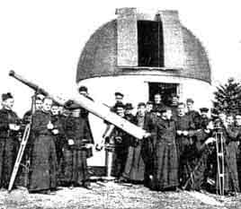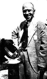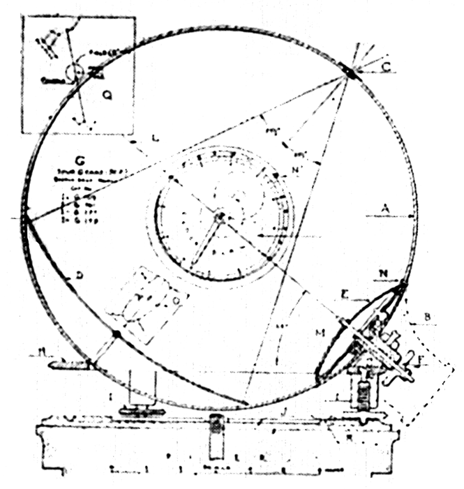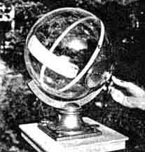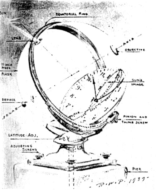 "Even in the crowded curriculum of studies at St. Mary's Major Seminary, astronomy has its place and holds an attraction for many a student. Its study serves a definitely practical purpose, since most of the seminarians will one day labor in foreign mission fields, where astronomical knowledge will supply in many ways what these primitive countries do not-aids in regard to time in regard to nautical determinations in surveying, and in exploration, to mention but a few. "A few years ago an observatory (Figure 1) was built at Techny, housing a 110 mm. refractor, a comet-seeker, the structure having been designed and constructed by the Brother Monks. But this telescope soon proved inadequate for the interest and enthusiasm of the star-gazers, and it was deemed advisable to construct a larger one, 8" in aperture, the work being done under the direction of Father Francis Neuhaus, S. V. D., one of the seminarians. Meanwhile, Brother Corsinus, S. V. D., an able mechanic, was busy constructing a well-balanced mounting, shown in the center. With a surprising minimum of cost, the reflector was completed, and now serves to great advantage, not only to bring more of the heavens within grasp, so to say, of the students of astronomy, but also to render celestial photography possible because of the new telescope's greater light - gathering power "Work on a 12-1/2" mirror for a still larger telescope is now under way. AMATEUR telescopticians, ten or twenty thousands of them, have now felt their way into about all the related arteries and capillaries of optics and astronomy. One such ramification is sundialing, and under sundialing come sun-clocks. Just what is a sun-clock? Invented by W. E. Cooke, government astronomer of New South Wales Australia, the sun-clock was described in this magazine in August, 1928, also August, 1935, by R. W. Porter. A ring or sometimes a C-shaped portion of a ring (Figure 2), carries a lens on the sunward side, and on the other an analemma, the familiar 8shaped curve of the equation of time. By turning a thumbnut with the fingers, until the Sun's image falls exactly on the analemma, hands taken from an ordinary clock are mechanically actuated through gear trains and the standard time is read on the clock dial-direct and not by a shadow, as in a sun-dial. There is, of course, no running clock movement. Working from the articles by Porter, cited above, Fred Ferson, 414 Reynoir Street, Biloxi, Mississippi, has made the sun-clock shown in Figure 3, and states that "careful construction and adjustment afford time within one minute, likewise the date. The base casting has four leveling screws and carries a second casting which supports in a curved slot a short, stubby, curved main standing arm. This can be slid circularly and clamped for latitude. At the end of this stubby arm is a rigid, hollow stud carrying the gear box and clock face and big, curved, rotatable fork. The fork has in its upper horn a slot in which is mounted a little lens of 8" f.l. The analemma is inscribed on a sheet brass plate bent to a radius equal to the f.l. of the lens (its radius of curvature is therefore nearly twice that of the fork- study Figure 7 if "nearly" is not at first clear) and attached to the lower horn. To find the time at any desired moment the large thumbnut extending, in Figure 3, below and to the left of the gear box is turned with the fingers, and gears with ratio 1, 2, and 24 do the rest; that is, 24 revolutions of the handwheel will rotate the minute hand 24 times, the hour hand twice, and the fork once. When the Sun's image is made to bisect the analemma curve the clock hands will automatically point to the hour and minute, also giving the date." Ferson will lend further details of construction to those seriously interested. Even now, more than a decade after he made his first sun-clock (Figure 2), Porter still composes new variations on the original theme and then makes the clocks. Figure 4 is one of these, as set up in his door-yard at Pasadena. "It consists," he writes, "first, of a spherical Pyrex flask carrying all the optical parts and the clock face, on which is also engraved the analemma. The entire unit is encircled by a grooved equatorial ring sliding on a segment below, which is fastened to the base. The equatorial gear used was a 32-pitch rack bent to fit the groove of the equatorial ring. "In adjusting the polar axis parallel to that of the Earth, a tubeless telescope, consisting of an eyepiece and objective, is fastened to the sphere at the poles of the encircling equatorial ring. The field of view of the eyepiece contains just the apparent orbit of Polaris about the true pole so that, by estimating the hour angle of Polaris by the stars in the Big Dipper and Cassiopeia, and using the base screws' the polar axis of the instrument can be directly fixed. "I find that the time can be relied on well within one minute. The glass flask was resorted to in order to protect all essential parts from the birds, who seemed to feel that I had made a gadget for their special benefit. The neck of the flask and a part of the sphere were removed with a 'biscuit cutter' (simply a cylinder of sheet metal) and abrasive. The plate of the clock, having nearly twice the radius of the sphere, was spun to its required curvature. All the machining was done on a wood-working lathe and drill press in the pattern shop here at The California Institute of Technology. Figure 5 is a photograph of another spherical globe sun-clock made earlier and partly similar." And still another! Some months after the above descriptions were received, there arrived from Porter a note (Figure 6) and the following description. "The clock to be described is about my tenth design and its performance has been so satisfactory that I have decided to call it quits and turn the information over to those who may wish to have a gadget in their gardens demonstrating an interesting problem in celestial mechanics. "The drawing (Fi