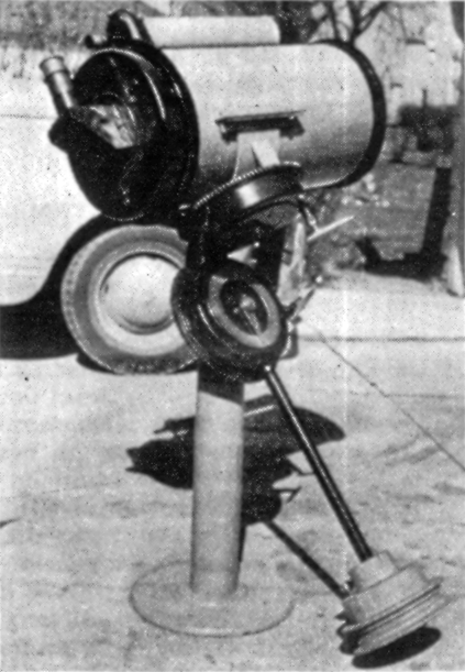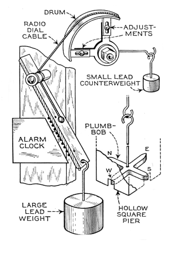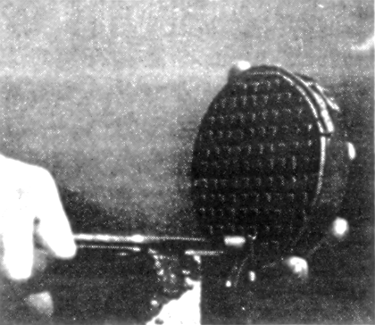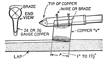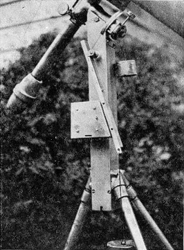 Baretic's letter reached these offices March 5 and not long afterward Jugoslavia was in the war. The Italian army was able to occupy his town of Susak, which lies just east of Fiume; there was no opposition, according to the daily press. One wonders where the telescope is now. A telescope of this kind has no tube-simply a "spinal column" for support. Readers not familiar with telescoptics often ask whether this is all right. A tubular support for the optical elements of a reflector is mechanically convenient, also conventional, but is not necessary from an optical point of view. PHOTOGRAPH of a grinding machine and amateur telescope maker, reproduced in Figure 2, reached us just before the first act of World War II, from Robert Wehn, Berlinerstrasse 37, Wermelskirchen, which our atlas shows to be close to Köln, or Cologne, Germany. We hinted to Herr Wehn that perhaps a Prussian telescopemaker's work would receive a better hand at some more fortunate time in world history and filed away the material. Now that things are worse, rather than better, we dig it out and publish it. Why? Just contrarinesswe were born under the sign of the goat and goats are contrary; we had one. Wehn says the machine was made by himself, according to the model of R. W. Porter. The power is a 1/5 horsepower motor and the spindle, crank-shaft, and main arm turn on ball bearings. As Köln has been bombed many times, one also wonders where this apparatus is now! IN his letter, Wehn recommends what he calls a "goatsfoot" for scooping out the channels in pitch laps. A goatsfoot is just a little rectangular piece of sheet metal, bent V-shaped and inserted in a wooden handle. The unchanneled lap is tipped up at an angle of about 45°, the goatsfoot is heated and started at the lower edge, cleanly cutting out and half melting out a strip of pitch as it is moved upward. This idea, in different variations, has previously been used by a number of American amateurs. J. F. Bauer, Altoona, Pa., does it with a hot cold-chisel (if you'll pardon the term), ground to an edge having the shape of the desired channel section, held vertically and drawn along the lap as a plow. This, however, doesn't get rid of the two ridges pushed up on either side of the plow. Wm. W. Peters, of the Department of Physics at Santa Barbara College, Santa Barbara, Calif., marks off the lines for the channels and then softens the pitch adjacent to them with a piece of electrically warmed resistance wire stretched across a hacksaw frame. He then uses the scraper shown in Figure 3 to remove the pitch. Our vote still goes to Bill Mason's Hot Plow principle, described here in December, 1935, and now repeated. Figure 4 tells the story, except that Mason said: "Do not try to make the groove full depth at the first stroke also pull the plow through the pitch rather than push it, and do it slowly." Figure 5 is a modification of this design, devised by Prof. Henry L Yeagley, of the Pennsylvnia State University. Here the plow is attached diagonally to the end of the soldering iron and the lap is held vertically so that the plowed out pitch automatically falls aside. Russell Porter tells us that the workers in the optical shop at the California Institute of Technology do it thus: The lap is poured and fixed in a horizontal position. A large knife is slowly passed through a flame, which heats it, and is then drawn through the lap. This melts and draws off some of the pitch. The pitch is scraped off by a V-shaped "scraper-offer" and, after several repetitions of this, the channel is finished. The "Pittsport Door Mat," so-called, or rubber grid, for making laps semiautomatically, as devised in 1935 by amateur telescope makers Everest, Munn, Morse, and Carlson, is still to be had, we learn, from the original makers, The H. O. Canfield Co., rubber works, Bridgeport, Conn., postpaid anywhere for a greenback. Its use is explained in "A.T.M.A." STELLAFANE convention, Saturday, August 2. EVEREST, in "A.T.M.A.," suggests that abrasives used in grinding be washed, or settled, even when taken directly from the can as purchased. Your scribe recently tried this and never a scratch was scratched. Dump the grains into a glass, stir vigorously till all are in suspension, let them settle, pour off the water, and spoon off the upper two thirds for use. If reckless, chuck the rest or, if Scottish, repeat the process with it and in turn with its remainder, and so on and on, till you faint. Kerosene for later grinding stages, instead of water, behaves normally, and no muss need be anticipated if the oil is dispensed from some kind of container having a small, controllable flow, also if something is provided to catch all the drippings from the tool For grinding three stages, also slushing off between wets, a single pint of kerosene is enough. Fine abrasives that remain wet, or even damp, with water, will spread badly on the tool with kerosene, hence they should either be dried up bone dry first, or washed in kerosene in the first place and put on wet with it. COMPARISET: "T.N.'s may have difficulty in judging whether the pits from any grade of abrasive have been completely removed by the next finer grade, even when using a magnifier," Cyril G. Wates, 7718 Jasper Ave., Edmonton, Alta., Canada, observes and continues: "I have found the following stunt helpful: Suppose we are using eight grades of abrasive. Cut nine pieces of plate glass (old windshield), each about 2" square. Take one piece as the tool, and mark the back of it. With this grind both sides of the other eight pieces, each with a different grade of abrasive. Wash the tool carefully between grades, of course. Mark each sample on one side only with the grade used. Now go back to the glass on which the coarsest grade was used, and grind the unmarked side for a minute or two with the next finest grade. The object is not to remove the pits but to show a surface partly ground with grade No. 2 and containing pits from grade No. 1. D