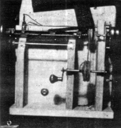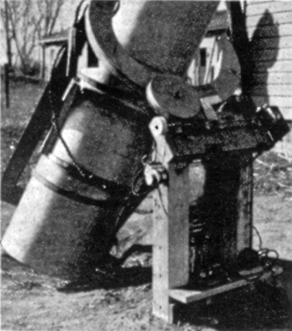 Figure 1 does not show much detail but there isn't much essential detail to the working principle-a fact which is all in its favor. Horizontally across the pedestal at about waist height there is a 10-32 thread-rod about 15" long. A Hansen 600 Synchron motor made by the Hansen Mfg. Co., Princeton, Ind., containing a gear train that reduces its speed to 2 r.p.m., is direct-connected to the right end of this rod through a simple, home-made clutch. A traveler moves on the thread-rod toward the left, and a 1/4" strip of 0.005" shim brass is connected to this traveler and runs around the nearer side of the large pulley, up over it and down to an idler and a counterweight hung below. The drive from this pulley through to the tube is by way of one of the two rolls on which the big split ring of the mounting rotates, the pulley shown being attached to the end of the stub shaft of that roll. The working principle may, however, be adapted to other types of mounting. "So there you have it," Walton writes. "Motor to thread-rod; traveler to brass strip to pulley; pulley to split ring; split ring to telescope." When the traveler has crept the length of the thread-rod, returning it to the beginning is a simple trick. And now for a little refinement that affords small manual adjustments, as in guiding. The left end of the thread-rod thrusts or butts square against the right end of another thread-rod. Now, if this second thread-rod is rotated in its own fixed screw, the effect will be either to add to or to subtract from the total motion of the telescope tube. This feature works as follows: On the nearer end of the second thread-rod is a simple pulley. A foot or so below this on the nearer post is another little Hansen motor belted to that pulley. Seen thrown loosely around the horseshoe, in the photograph is a heavy wire. This is the flexible distant, hand control for slowing or speeding the drive by operating that motor at will. A double switch, made from spring clothes-pins and held in the hand, does the trick. To advance the tube slightly, you give the little motor an electric kick. To retard it, you cut the current of the main motor. "No gears to throw in or out, no clamps, no nothing," Walton says. You push the telescope to a star and the drive takes charge from there. He sent some photographs-Pleiades, comet, nebula-made with this guiding control and these speak well for the whole equipment, including the 12" mirror of the telescope. Walton's neighbor, Bohm, mentioned above, took one look at the drive and ran home to cook up one for himself (Figure 2). It varies a little from Walton's; few amateurs like to copy slavishly. It has no micro-adjusting feature for guiding, hence it is only for visual use. Main motor at right (cost $2) drives screw-rod (cost 5 cents) at 2 r.p.m. through simple clutch. Since the screw-rod has 32 threads per inch, the nut traveler which tows the telescope tube along moves toward the left at the rate of 1" per 16 minutes, and Bohm points out that it is a matter of simple arithmetic to find how far out from the center of the polar axis to attach the little rod that connects the traveler to the lever that drives the tube final adjustment may then be made exact if there is a slotted hole in this lever. Bohm also has a friction connection between his lever and polar axis, this being the equivalent of a friction disk drive, and this permits quick large shifts while the motor is running. The weight seen pendant in Figure 2 pulls on a silk fishline running over two small pulleys and to the traveler. This helps the motor and holds the rod against the thrust bearing near the extreme left. What at first appears to be a flywheel, at the left, is simply the convenient handle of an end-thrust screw for the screw plug which takes the end-thrust of the thread-rod. After about an hour's running the traveler reaches the end of the thread-rod (what it actually reaches just before that, however, is a little limit switch which shuts off the motor in case the observer forgets, thus forestalling a jam). At the end of the hour's run the handwheel is unscrewed and removed, the thread-rod slid far enough to the left to disengage the "clutch" connection at the right. Then, by means of the little; crank handle visible below, the traveler is spun back to the starting point in a hurry, ready for the next hour's driving. It sounds complicated, but actually it all works quickly. Bohm says that, with this drive, it is possible to keep an object in the center of the field with a high-powered eyepiece for the hour's run on the thread-rod. IN NO place in "A.T.M.," unfortunately, is it clearly pointed out that the handle to be attached to the mirror disk for grinding and polishing (unless the worker prefers to omit it entirely, as some do, and simply take hold of the disk itself ) is not intended to be grasped in the hand in the typical manner of a handle but is rather a convenient centering device, There is evidence that some beginners do, however, grasp it in one hand, full length, and tightly, throughout grinding and polishing. The result often is a badly turned edge since the pushing effort is usually too high, also since it is practically impossible not to introduce undesirable lateral force components when working this way. (You can pick up a cat by the tail, close to the body, and swing it without a protest, provided you don't bend the tail in any part of the swing, but the cat will tell you from experience that, when you say you don't, you only think you don't.) Probably the whole trouble into which many beginners are misled derives from the unfortunate use of the term "handle." In "A.T.M.A.," Everest discusses the effect of pressure applied too high and shows one excellent form of centering device: a 4 1/2" by 1 1/2" wooden disk, for working, carries on its top a 4" by 1" handle for lifting the mirror. This keeps the working pressure low. STELLAFANE convention, Springfield, Vermont, Saturday, August