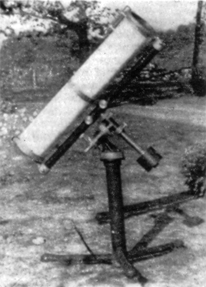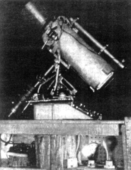 There are three kinds, or degrees, of portability-hand; trundle, and car. Hand portability: It is pretty difficult to design a rigid reflector of the 6" aperture usually recommended to the beginner without bringing the weight above 50 pounds; usually it will run 100. By reducing the aperture to 4", which still provides an excellent telescope, the weight can be greatly reduced, on the basis that the weight of a telescope is roughly proportional to the cube of the aperture. It is possible to lighten the parts of a 4" telescope enough to permit carrying it like a violin case or midget outboard motor without much sacrifice of rigidity. Trundle portability: In cases where no permanent pier can be set in the earth, yet where the owner wishes a telescope of 6" or 8" aperture, large casters or small wheels can be added to the mounting of a telescope weighing up to, say, 300 pounds, and it then can be trundled outdoors, set up, used, then trundled in again. Numerous solutions of this problem have been published in this column and every maker concocts another. Car portability: Here weight isn't the main governing factor. The mounting should knock down in about three pieces, yet be settable-uppable without recourse to an erecting crane and short of half of one night, and be knockable-downable the same. Otherwise, no great compromise on rigidity need be made and the portable can be as useful as a fixed telescope. Figure 1 shows an 8", car portable designed and made by C. R. Wassell, of the Wassell Manufacturing Co., oil purifiers, Muskegon, Mich. It weighs 150 pounds. Pedestal of 4" seamless steel tubing, welded. At its top, under the head, are beveled filler rings that permit adjustment for latitude, so that the telescope may be used about 2 1/2 degrees north or 2 1/2 degrees south of its home town, simply by adding or subtracting some of these wedge-shaped rings. The axes are rugged, the hollow polar axis being 2 3/8" in diameter at the point A, Figure 2, or point of greatest bending moment, and stepped down to 1 1/4" at the other end. Ball bearing. In place of the usual central saddle for attaching the tube to the declination axis there is a full-length piece of 1" tubing. At its ends it fits into sockets in the side of cast, machined rings. In these rings the telescope tube rotates, so that stars in awkward positions may be sighted and the finder used, without neck-wringing contortions. This, then, turns out to be anything but a makeshift type of portable; on the contrary, it is a fine piece of work requiring no small amount of machining-as would perhaps be more evident if it were not, because of its portability, associated with the chicken-foot type of pedestal often seen on less refined telescopes. It is possible, then, to have a really refined telescope of fairly good aperture with car portability, well, anyway, provided the back-seat driver and family manager doesn't preempt the necessary space for other things. But why not design the interior of the tube to be used as a trunk, masculine gender, for sox, spare pants, and so on? Probably good enough for a mere man on a vacation trip. IT'S a lot of fun, as any amateur telescope maker will tell you, to invent, design, and then build gadgets to save labor, even if the actual labor saving is a minus quantity. You get your pay when you can step aside and watch them function automatically, with a self-satisfied grin on your face. Who cares about time, anyway? Top-flight position as Public Gadgeteer No. 1 undoubtedly has now been won by Kenneth Richter, 33 Clarence Ave., Bridgewater, Mass., whose star camera works while he sleeps. It is in storage just now, as Richter is away at Harvard and in summer is running a "Chromocinemataudiographic Expedition, Ltd." (possibly "limited" refers to the funds) somewhere between Hudson Bay and the N. Pole. Nevertheless we invited him to remove the bushel from off its light, so the rest of us could see its glimmer. So--- "The desire for the instrument was born of the fact that we have but two seasons in Bridgewater-the cold season and the mosquito season, and both are too uncomfortable for visual guiding of an astronomical camera. Therefore, about a year's work was spent overcoming the discomfort of attending the camera throughout the nightthe exposure is made automatically. "At about dark, I go out, lift the cover off the instrument, and pull out the plate holder slide against a stop. Next, I go in and set a clock by my bedside for the time I want the exposure to start, also for the length of time it is to run. Then I work on a mirror, take the girl friend to a movie (though building the thing kept me so broke that this is just wishful thinking) or I go to bed. "At, say, 2 A.M., the clock turns on the power. Outside, the camera springs to life. A small motor swings the flap shutter open, and an electromagnet holds it thereafter when the small motor has shut itself off by breaking its own circuit just as the shutter strikes the magnet. The latter is energized by a radio 'A' eliminator, to avoid the vibration of the camera that would result from the use of an A.C. magnet. This is a satisfactory source of 6-v., D.C., well filtered. Meanwhile a synchronous motor drive, using one of the hen's-teeth 4-watt Warren motors, has started to apply the diurnal motion. "Extra features include a Nichrome wire wrapped around the lens barrel, with thermostatic control to keep the entire lens about 10° C. warmer than the outside air. This is adjustable for more heat, in case of heavier dew than usual, but it effectively prevents the condensation of moisture on the glass, and there is not enough heat to distort the image to any measurable degree. "The 500mm f.1, f/6 lens is an anastigmat that would cut a good figure in any company. "The cross-hairs in the finder have bright or dark line illumination, of which both the color and intensity is variable; color by cellophane filters placed before the bulb (usually red), and intensity b