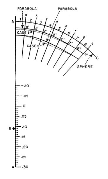Referring to Figure 4, draw the line AA to represent the axis of the mirror. Lay out the arbitrary scale on this line, each division representing .01" aberration. It is suggested that AA may be 10" long, and each scale division 1/8". Find the point B on the scale at one half the total correct aberration; in this case .110". With B as a center, describe the arc AC, and lay off the equidistant points a, b, c, and so on to represent the zones. On the scale suggested these points may be about 3/4" apart. Draw radii from these points toward B. Refer to the table and note that the correct aberration of zone 8 is .220". Set one point of the dividers at .220 on the scale and the other point at any convenient place h' just within the circular arc. Prick h' and g'. Now set one point of the dividers at .165", the aberration for zone 7, and adjust the other point to rest at g'. With this radius, prick f'. Continue this process until each radius has a prick-point according to the table. Join these points with a straightedge and pencil. The resultant "curve" represents the correct parabola. Referring again to the table, note that in Case 1, zones 1, 2, 7, 8 are correct, but that the other zones are all over-corrected. Starting at point h', prick off the points as before, taking the readings as shown under Case 1. The resultant "curve" is the actual surface of the mirror. It will be seen that the actual surface in zones 7 and 8 coincides with the parabola, but that the surface in zones 1 and 2, for which the readings were also "correct," is parallel to, but not coincident with, the parabola. It is apparent that glass must be removed from the center tapering out to f', and that something in the nature of a small star lap, and the use of a stroke which will bring the points of the star to f, is called for. Referring again to the table, Case 2, it will be seen that zones 1 and 8 are "correct," zones 2, 3, 4, 5, greatly under-corrected, and zones 6, 7, overcorrected. When the curve is plotted, as shown in Figure 4, it will be found that zones 1 and 8 actually coincide with the parabola, but that the rest of the surface constitutes a raised band, which is highest at zone 5. A ring lap seems to be the remedy, with a stroke which will confine the abrasive action between a' and g'. It will have been noted that in both these cases the graph was started at the edge, with the idea of getting all the surplus glass outside the parabola, but in some cases it may be necessary to start at the center, or even at some intermediate zone. A little experimenting will soon make this point clear. If the scale and radii are drawn in ink, the various graphs may be drawn in pencil and erased as often as desired. CLUB of amateur telescope makers--The Sixteen-Inch Club --who would, by clubbing together, obtain a greatly reduced price on 16" Pyrex disks, was announced in the July number, Clyde W. Tombaugh, Lowell Observatory, Flagstaff, Arizona, being the sponsor. Since then the club has gone over the top--gained its necessary 20 members. This reduced the cost of disks to only $35, tools to $7.80. A 16" is a nice size--big, but not too big. As we go to press we don't know whether it is, or is not, too late for others to get in on this club. To find out, if interested, write to Tombaugh. TEST: "While doing my second fining down with Levigated Alumina," A. M. Mackintosh, Inspector of Police, 70 Arnold Road, Kingston, Jamaica, B. W. I., writes, "the following test occurred to me because the film between the mirror and the tool is so thin with Levigated Alumina that it is almost completely transparent. Draw the tool slightly over the edge of the mirror and look through it at the edge of the mirror. If there is the slightest thickening at the edge, turned edge is present. Of course this will show only a turned 'mountain'."