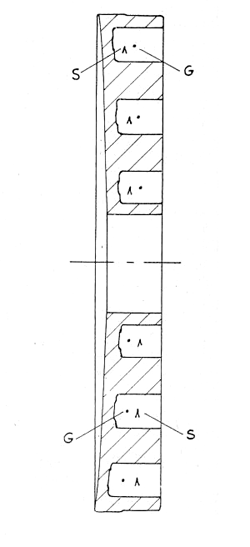 "The cause of the vertical astigmatism lies in the structure of the mirror itself, combined, of course, with the method of internal support. Suppose the mirror is tipped up so that its axis is horizontal. Its weight then is carried by the 36 levers whose points of contact are in the rib structure and something like four or five inches behind the continuous front of the mirror. Let us think of one of the hexagons (Figure 5), into which we divided the mirror in the previous discussion, as made up of two parts: first, the solid front curved plate and second, the ribs. The front plate is about twice as stiff in a vertical plane as the rib system is. "If now the support point were located at the center of gravity (actually, on the axis of the 'pocket'), the half of our unit below the center of gravity would be in tension, so that it would stretch; while the part above would be in compression. Also, the deformation of the ribbed part would be twice as great as that of the solid front. If the undeformed front surface were a plane, it would, under this deformation, become slightly S-shaped vertically; that is, the upper half would be slightly convex, the lower slightly concave. Since, instead of a plane, we have a spherical surface in the undeformed condition, the deformed condition will consist in the addition of a very weak convex cylinder to the upper half and a similar concave cylinder to the lower half of the unit. Taking now the whole mirror, each of the 36 parts would be similarly deformed, but there would be no general deformation of the surface as a whole. "Return now to the actual case. See Figure, 5. The supporting point is on the upper surface of the 'pocket' which lies some 6" or 6 1/2" above the center of gravity. The part A that becomes convex is therefore 6" shorter than the lower part near B, which becomes concave. So we may say that, on the whole, the unit is concave; and when we now add up the 36 parts we find, in addition to the local deformation of each unit, a general (net) vertical concavity of the whole surface, which is what has been observed. The diagrams of Figure 5 will perhaps aid in understanding this. The local deformations of each unit are of course present, but they are so very much smaller than the net deformation that, provided the latter is small, the former will be too small to be observed. "If, in Figure 5, the support S could be located on line CG, curve AB would be symmetrical about CG, and the net curvature of AB would be zero. "Clearly the effect just discussed will be absent, or have zero value, when the axis of the mirror is vertical. As the mirror axis is tilted toward the horizon, the effect will vary as thee sine of the zenith distance. To correct it, a system of 12 gravity-operated 'squeeze levers' were applied, acting on the outer edge of the disk near the back, which when the axis of the mirror is horizontal, act so as to correct the error. Since their effect also varies as the sine of the zenith distance, the compensation will be correct in all positions of the axis. "The second phenomenon mentioned above-that is, vertical astigmatism in two orientations 180° apart-is caused by a maladjustment of the supporting levers, and, like the one just discussed, is absent when the mirror faces the zenith. Let us again consider the mirror tipped up with axis horizontal, and assume that the supporting levers such as S, Figure 6, in the upper half are on the average so adjusted that their supporting points are somewhat in front of the center of gravity surface in the mirror, while those of the lower half are misplaced in the opposite direction. Reference to the same figure will make it clear that, in the assumed position, the radius of curvature in the vertical plane will be lengthened, while if the mirror is rotated 180°, the radius will be shortened by the same amount. Here the remedy is obvious.