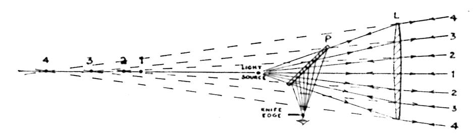 "In order to test for astigmatism when the mirror faces the zenith, the arrangement shown in Figure 7 was employed. The light source and the knife-edge are, as usual, near CC. The plane mirrors MM, at 45°, are 8" in diameter. By rotating the large mirror the zone indicated by the dashed line may be tested for astigmatism. By adjusting the counter-weights of the 'lifting component' of the supporting levers, any observed small amount of astigmatism may be removed. "The work of making the mirror surface a satisfactory sphere having a radius of curvature of 1335.7" was completed in August, 1941. Parabolizing by alternate fine grinding and polishing was started August 30, and is now very nearly completed 'in the rough', meaning thereby that the radii of zones are very close to the calculated values. The long work of smoothing and final figuring still remains to be done. Testing will be done near the center of curvature, using a method worked out by Dr. F. E. Ross and the author. The method is new as far as we are aware; however, it would not surprise us if it should prove to be 95 'old as the hills'-for no complete search of the literature has so far been made. The method is shown in Figure 8. The lens L is so designed that, when the light source is placed at a point between its focus and the lens, the spherical aberration at its virtual conjugate focus is such that the conjugate focal points for different zones of the lens coincide with the 'centers of curvature' of the corresponding zones of the paraboloid. The light source is shown on the axis. To the right of the lens the rays travel along the normals to the paraboloid, whence they are returned along the normals and would converge to the source -but, by the aid of the half-silvered plate P, the returning light is brought to the knife-edge as shown. The source and knife-edge may be interchanged.