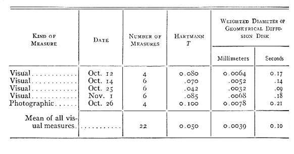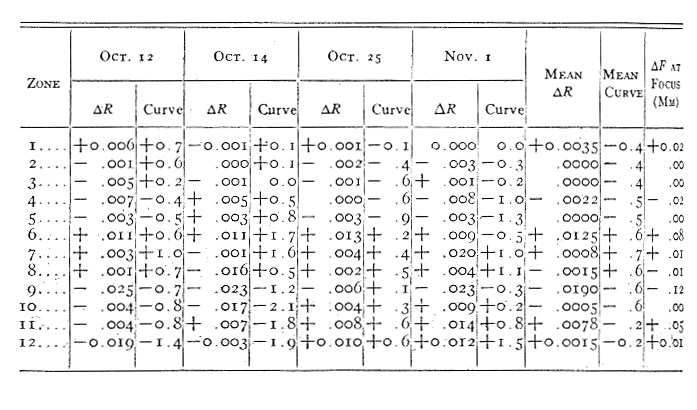 The focal length of the completed mirror was carefully measured before the reductions of the final measures, as 319.656", or 811.928 cm; and with this focal length the intersections of the 12 zones used in the visual tests and the 15 in the Hartmann test were computed anew, and are given in Table I. On the left-hand side the units are inches and on the right centimeters, as the separation of the zones, which are those of the diaphragm used in the Hartmann test and the pitch of the screw used in measuring the photographs, are given in these units. The recomputation was necessary, as the difference between these positions and those for the focal length of 320" amounts to 0.005", or 0.12 mm, which is quite significant with so good a mirror as the 82". The visual measures of the intersections of the pencils from the various zones were made on October 12 and October 14, immediately after the parabolizing was completed, and again on October 26 and November 1, after the mirror was aluminized. There were four independent sets of measures on October 12 and six each on the other three dates, equally divided between, and alternated by, Mr. Lundin and myself. The separation of the scratches was measured by dividers on a steel rule divided into fiftieths and hundredths of an inch. These measures, or rather the differences between the observed and the computed position