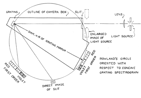 Such an amateur is R. M. Watrous, M.D., 1924 Flora Place, Highland Park, Ill., and his account, written by request, follows: "The concave grating spectrograph is undoubtedly the simplest of all types for the amateur to construct because it has only one optical surface, requires no collimating or objective lenses, and can be constructed to give almost any desired amount of dispersion. The essential optical part can be bought for $4.50 and up; the rest of the instrument for the most part can be made of wood and scrap brass, and does not require elaborate machining. Scientific supply houses, such as the Central Scientific Co., Chicago, list in their catalogues a variety of replica gratings made by taking collodion impressions of famous gratings ruled on glass. These are offered in three grades at three sets of prices, depending on the degree of faithfulness with which the original rulings are reproduced. The medium grade has been found to give amply good performance in the instrument to be described. Replica gratings can be obtained mounted on silvered spherical concave mirrors of various focal lengths, and one of these is the only optical part needed for a concave grating spectrograph. "The concave grating spectrograph may have various forms, but all are dictated by the optical principle laid down by Rowland, which states that the slit, the grating, and the spectrum must all three lie on the circumference of a circle whose diameter is equal to the radius of curvature of the mirror on which the grating is mounted. The mirror and the spectrum must lie at opposite ends of one diameter of the circle, in order to have images of the slit in focus, so the only possible variations in design must he obtained by changing the location of the slit along the circumference of the circle. In practice, the parts are arranged as shown in Figure 1.