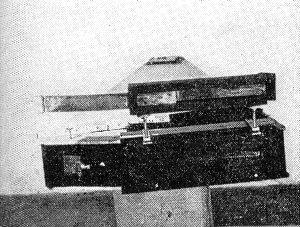 "In order to understand how images are formed by a concave grating, it is worth while to imagine the mirror on which the replica is mounted set up facing the observer as for a Foucault test, using a slit at the center of curvature as the source of light. Under such circumstances, the image of the slit will be cast back upon it, and a percentage of the light striking the mirror will be returned. However, the grating will cause some of the light to be diffracted, with the result that varicolored images of the slit will be formed both to the right and to the left of the direct image Thus there are two first-order spectra. To the right and left of these respectively will be another set of colored images, forming the second-order spectra, and beyond these will be third-, fourth-, and nth order spectra, each fainter and more spread out than the last. If the slit be now moved to one side sufficiently, and also be brought closer to the mirror, to preserve the relationships of Rowland's circle, the direct image of the slit will move in the opposite direction, as will all the spectra until a position is reached in which the images will lie in the positions shown in the figure. By moving the slit still farther, the second-order spectrum could be brought opposite the mirror. [Detail in extension of this particular paragraph, by Dr. Watrous, may be borrowed from this department on request by readers interested in this type of spectroscope.-Ed.] "Having determined the dimensions required to secure the relationship shown in the figure with any given concave grating, it is necessary only to construct a box to support the parts and exclude light, and one has a spectrograph. A film-holder may be made, to support films at the point where the spectrum comes to focus, or a telescope eyepiece may be supported at this point for direct observation. With such an instrument, clear spectrograms may be obtained 8" long, showing hundreds of details such as Fraunhofer lines. The light obtained by sparking two iron nails across the terminals of a storage battery will give a beautiful line spectrum of iron. Light passed through solutions of hemoglobin, dyes, chlorophyll, and others, will show characteristic absorption bands. Bunsen's famous experiment with the sodium flame can be performed; and so on. "In choosing a grating, a few facts should be kept in mind. The degree of dispersion (and thus the length of the first-order spectrum) is proportional t the number of lines per inch in the grating and to the focal length of the mirror. The resolving power, however, depend on the area of the grating and the accuracy of the ruling. The spectrograph shown (Figure 2) contains a medium grade grating of about 40" radius of curvature, with 14,500 lines to the inch an a grating area of about 2 x 3 centimeters. "The box is made of plywood, painted black inside, and with light baffles locate at strategic points. The adjustable slit mechanism is on the left. The sliding adjustment for the film-holder is on the right, actuated by the two vertical screws In Figure 2 the film-holder has been removed and is resting on top of these screws, its slide pulled two thirds of the way out to show how it is loaded. The main body of the camera extends into the background, with a small square porthole in the far end to give access to the adjustments of the grating mount. [In Figure 1 the slit is on the right of the spectrum but it matters not.-Ed.] "The slit of a spectroscope is one the essential parts, since every detail the spectrum is actually an image of slit. Its edges should be as smooth and as parallel as the maker's skill can contrive, and one may lavish as much or as little care on it as he wishes. For ordinary work, a slit 0.002" to.0.003" in width is suitable, and there is very little actual use for an adjustable width. Provision should be made for rotating the slit mounting to line it up parallel with the ruling of the grating for best definition, and it should be mounted in a draw-tube so that its distance from the mirror can be varied slightly for focus. "The jaws of the slit may be made of brass and should be filed to a chisel edge and then sharpened like a chisel on a flat piece of plate glass, using finishing emery. After the edge is sharp, it may be placed on a very clean, smooth piece of plate glass and gently pressed down. This will smooth out the "saw" edge and give a perfectly straight line. The two jaws should then be placed in their channels and closed gently together in front of a strong light. I believe that irregularities of less than .001" can be detected with this test. The most difficult part of an adjustable slit to make is the parallel channels in which the jaws are to slide. Not having a milling machine, I built these up out of strip brass. [By using a principle to be described next month, this problem is avoided.-Ed.] "Thirty-five millimeter film is very useful for making spectrographs, and a holder may readily be designed to accommodate strips long enough to take in the full length of the spectrum. The film should be held in a curve conforming to Rowland's circle. Though it adds considerably to the problems of construction, a slide which permits the film holder to be moved at right angles to the length of the spectrum in the same plane will prove well worth while, since it allows up to ten spectra to be made on one film, with all the advantages of being lined up for comparison with one another. With such an arrangement, a narrow slit-like mask should be placed just in front of the focal plane so that each spectrum occupies a strip about 2 mm wide running the length of the film. "The grating mount, as all telescope makers will realize, must be adjustable as to tilt in two dimensions, and it must have an adjustment for rotation about the mirror axis, in order to line up the rulings in a vertical position. "Light sources are many and varied, the ordinary incandescent filament lamp gives a disappointing spectrum. Sun