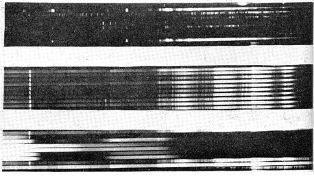 "Figure 3 shows three contact prints made from portions of negatives obtained in the instrument. They extend from the orange to the violet. Violet is on the right. Top. Arc and spark spectra of metals; from top to bottom: aluminum arc; 15,000-volt condensed spark between A1 electrodes; iron arc; spark between iron electrodes; copper arc; copper spark; nickel arc; nickel spark; spark between platinum electrodes. "Middle: Series of exposures made with carbon arc for purpose of focusing slit. "Bottom: Absorption spectra of hemoglobin derivatives: carbon arc; next two, light from incandescent portion of carbon arc passed through hemoglobin solutions; next two, same through methemoglobin solutions; next two, same through carbon-monoxide-hemoglobin (note shifting of the, two dark bands to the right); carbon arc. "The two D lines of sodium are especially prominent in most of the negatives made with light from the carbon arc. They appear near the left margin in middle set of spectrograms, and serve convenient landmarks. "Brode's 'Chemical Spectroscopy,' 1939, is a fine technical work with 120-page tables of wavelengths and other things but no information on building spectroscopes. The old maestro of the subject was Baly, whose 3-volume 'Spectroscopy' was published in 1912, but this, too, is pretty technical and is no longer in print." NEXT month two or three shorter items on amateur spectroscopy will be presented in this department. STELLAFANE convention of amateur astronomers and telescope makers has been called off this summer. War.