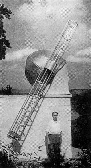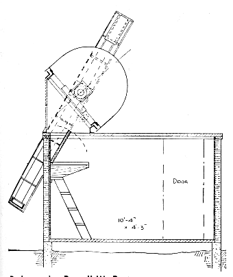 The telescope itself, when examined closely, proves to be more conventional in type than the first glance suggests. It is a simple, ordinary Newtonian, 12 1/2" in aperture, an f/9; its 100-pound counterweight being carried on an extension of the tube rather than in separate form. This makes the tube 14' long. There are no added reflections-no siderostat as, for example, at Stellafane's turret telescope. This, of course, entails reversing the dome-toward the building as shown. In this type of telescope the observer within the dome looks into an eyepiece which lies in the declination axis. He also stands within the polar axis, which is expanded into a big ring to permit his entrance into it.