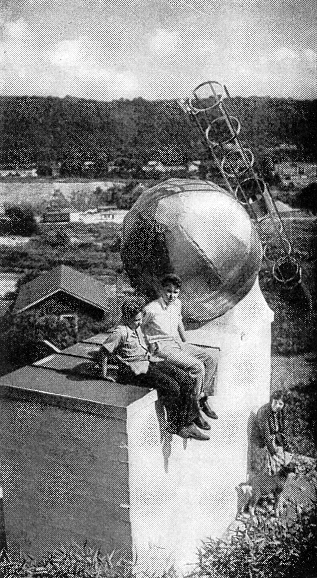 iron, and slanted at 49°15'. The web space between the basal rectangle and the fixed ring is filled in with metal lath and plastered inside and outside with 2" of concrete through which there is a window (Figure 2) 14" by 27". Bolted to the fixed ring, three 3 1/8" ball-bearing rollers from automobile rear axle housings. Pressed on one of these three rollers a 10" worm wheel to provide the friction drive to rotate the dome (done by an automobile window crank). At right angles to these rollers, two 4 3/8" thrust bearing rollers to prevent the movable ring and its attached telescope from slipping off. A 215-pound movable ring of 3 5/8" by 4 3/8" angle iron. This carries the telescope, the dome, and the hour circle. Welded on the movable ring a 2' length of 4" by 6" angle iron, as a base, and on this a square piece of 12" flange beam, stood on end. This unit carries the mounting for the tube, also a declination slip plate, eyepiece holder, holder for 2 1/2" elliptical flat, declination and setting circle, declination worm, and ball bearings. A blueprint of these details may be had gratis from the owner. In its swing, or traverse, the eyepiece does not rise more than 1' above its lowest ( E. and W. ) positions. On the above unit the tube, 14" inside diameter, built of 1" by 1" tee-bar straights and 1 l/4" by l/4" by 1/2" hoops. At its upper end the tube carries a 100-pound counterweight. Attached to the movable ring a dome of galvanized, riveted, sheet steel. Its interior is marked with latitude and meridian circles. Prominent stars and nebulae are indicated on it, with their R.A. and Dec., so that these and other landmarks can be found instantly. A 12 1/2" mirror which, before silvering, was subjected to the criticism of Norbert J. Schell, Beaver Falls, Pa., of off-axis and criss-cross off-axis telescope fame. When the telescope is not in actual use, the mirror is left in it covered by a latched lid. A 3' sack, like a big mailsack (Figure 3), is drawn over the end of the tube as a protection against rain, and the tube is then turned mirror end up. The 300-pound tube unit, including the tube's own 100-pound counterweight, is hung on one side of the movable ring. This is balanced by a 570-pound counterweight mounted inside the dome opposite the telescope. In the photographs (Figures 1, 2, and 3) are seen respectively: Weertman; Billy Weertman, Mrs. Weertman; John Cool, Billy again, and at ground level Mrs. Weertman again with Betty Tulip Weertman, Billy's goat (not, however, a billygoat). All-especially Mrs. Weertman-assisted in the work, even Betty. That is, when anybody made a mistake, Betty was the goat. Weertman says the observatory once served as a fort. No sooner had he finished the concrete doorstep than a "halitosis kitty" ambled up, drove him inside and left his or her footprints in the soft concrete. Altogether, this is a notable telescope. PARTIAL silvering, sometimes spoken of as half-silvering, is sometimes desired for optical instruments. Accomplishing it by the familiar Brashear process often requires agility and involves an element of uncertainty, since the silver ordinarily is deposited too quickly to permit calm, steady observation and quantitative control. Two readers of this department, Dr. Henry Paul, of the Norwich Pharmical Company, a chemist, and Dr. Wilbur Silvertooth, of Paramount Pictures, Inc., a physicist-both amateur telescope makers-have called to our attention a new method of partial silvering originally described in Industrial and Engineering Chemistry (May, 1942) by Robert D. Barnard, M.D., of The Chicago Medical School, as follows: "The surface should be cleaned with hot chromate sulfuric acid solution and thoroughly rinsed with distilled water. It is unnecessary to use the application of caustic soda so often recommended. If a drop of distilled water will spread evenly over the entire surface, it may be considered free from grease or other organic matter. "About a half liter of (1) a 10 percent silver nitrate solution containing one or two drops of concentrated nitric acid and of (2) a 10 percent solution of technical triethanolamine are conveniently made up. Both solutions will keep indefinitely. "The surface to be mirrored is placed face upward in a clean Petri dish of sufficient diameter to accommodate it. To 25 cc. of solution l in a large test tube are added 10 cc. of solution 2: then, with constant agitation, further additions are made of 2 or 3 cc. at a time just to the point where the precipitate which forms on the first addition clears completely. The mixed solution is poured immediately over the object to bc plated so as to cover it by a layer of at least 0.25 inch. The deposition of silver begins within a few seconds. "For the half-reflecting surface required for interferometers, a layer of silver which transmits about as much light as it reflects is ideal. Such a layer has a distinct violet tinge and appears within l0 minutes at room temperature. "For completely reflecting surfaces, the immersion may last for 24 hours; this particular bath is unique in that the deposition seems to be continuous for that length of time. "The Petri dish gives good visual control of the extent of plating, since deposition of silver occurs only on a surface and not through the body of the solution. It is possible that the low surface tension of the triethanolamine may be responsible for this phenomenon. "When the desired thickness is deposited, the plated object is taken from the bath only the edges being handled." Dr. Silvertooth, mentioned above, states that "We have used the method here at Paramount Pictures, Inc., with considerable success, in preparing partial transmission films." Dr. Paul, also mentioned above, suggests caution in adding nitric acid to as concentrated a solution of silver nitrate as is used in the Barnard Method-risk of explosion (see warnings in "A.T.M.," pages 412-415). In this, Dr. Barnard concurs. The triethanolamine needed is easily obta