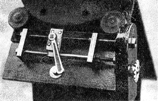 "The hand is pulled by a screw of 12 threads per inch, by means of a nut which has a yoke over the top-the band passing between the top of the nut and the yoke. An eccentric pin or shaft enables the band to be clamped firmly to the nut at any point, a simple wrench turning the eccentric pin as shown. When not clamped, the band can slide freely as the mounting is moved in right ascension. "The drive begins with a 12-watt Telechron motor which is enclosed in a box below the main plate, continues through a train of helical gears in the narrow box at the right, terminating in the screw. The knobbed wheel on the gear box is a clutch to disengage the gears, which is necessary in order to run the nut back on the screw after it has traveled from left to right. This takes only a minute or so and, as it takes about three hours for the nut to travel the length of the screw, a single resetting will take care of an entire evening. "The whole assembly, with the exception of the band, is in one piece and is attached by the single bolt shown just below the wrench (the pin and yoke are first slipped off, however, and the band remains on the mounting). The base of the assembly is 1/2" steel plate. The bar below and parallel to the screw serves the dual purpose of tie-rod and guide for the nut. "There is no claim for originality in this design."