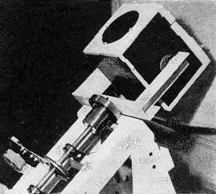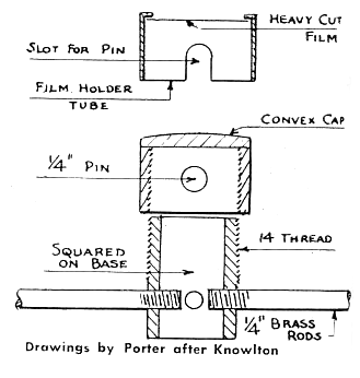 SCHMIDT camera and mounting, made by Philip Knowlton, 83 LaSalle Street, New York, New York, is shown in Figure 2. It has an 8" Pyrex mirror stopped to 7", a 3 1/2" correcting lens and rates as f/1.9. Correcting lens is a disk of Vitaglass 1/32" thick, figured flat on one side; on the other convexed, then concaved near the edge. It has an extra stop which works at f/4, also a 77mm haze filter. Tube is 1/2" five-ply plywood reinforced with 16-gage iron. "Fussiest job," Knowlton writes, "was design of film holder." Figure 3 shows the one made. "By experience I found that the focus is so short that the back of my hand contacts the mirror while loading film. "Plate glass would have been easier than Pyrex to grind so deep for the mirror if no machine had been available. A machine should be used-for if anyone thinks there's a lot of rub-rub-rub to a common 6" f/8 mirror, let him try a Schmidt by hand-mine took the spare time of 10 months. But it was not as difficult as at first it seemed-mainly tedious.