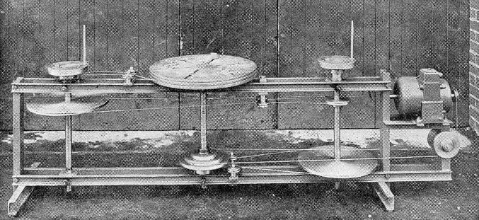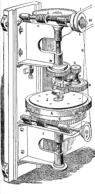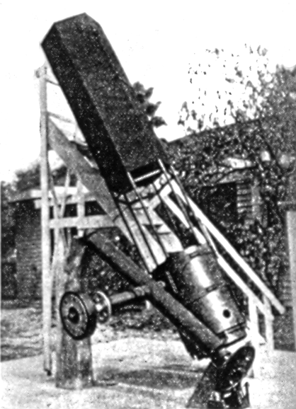 Asked to give further detail about the 18" telescope, which is mounted as proposed by Porter in "A.T.M.", page 139, he writes: "Most telescope drives shown in the "A.T.M." books show the motor on the foundation or the frame of the telescope. I have tried that and attempted to smother the vibration, or rather cut it off from the telescope, by various kinds of pads and vibration insulators, but always found an annoying slight vibration, especially in some positions of the telescope, that interfered with sharp vision. So I have put my synchronous motor in a little two-story 'dog house' located on one side of the telescope platform just visible at the right in the photograph. The motor is mounted on a block of concrete which sits on a hole filled with sand. It is belted to a reduction gear which is on its own separate foundation, and the gear to a shaft which runs through a conduit under the platform and is geared to the worm which drives the large worm gear at end of the polar axle. I have absolutely no trouble from motor vibration. "The upper story of this little house opens onto the telescope platform and in it I keep star maps and the odds and ends that one uses about a telescope. The switch-controlling motor is also here. "An accessory that is rather important with so large a telescope is the observing step platform, which the photograph shows beside the telescope. At first I used an ordinary 12' stepladder, but it is surprising to note the number of persons who are more or less timid when they climb a few feet off the ground, especially the ladies. So I built the step platform. The steps are 10" wide and there is a strung rail on each side. You stand on the step that suits your height, lean on or grasp the rail, and take a look. You are relaxed and comfortable. Much of the time you are looking downward, the most comfortable position, and the step is so solid that the most timid feel no fear. For convenience in moving around, the two legs are provided with large casters. You grasp the lower ends of the rails and push it around like a wheelbarrow. "Are there any advantages in a large telescope ? My experience is that when the seeing is good you get just that much more illumination and see better and more, but when the seeing is poor the big telescope gives no gain. Often, in fact, a smaller instrument will show more." THE LATE J. H. Hindle, of England, was one of a minority of amateur telescope makers who prefer machines to hand work. Figure 2 is a clean-cut machine he was building when the war intervened. It never was completed. Hindle sent no descriptive data, but a close study of the photograph will afford useful ideas. Hindle's machines for grinding and polishing embody a principle in which the mirror rides on top, just as in hand grinding, and is free to rotate of its own accord and does so rotate. Earliest origin of this idea, so far as is known, is the machine of Lord Rosse, described in Sir John Herschel's old volume, "The scope," dated 1861. Here it is the iron tool which rides on top (KL, Figure 3), mirror being beneath and immersed continually in water to within an inch of its surface. M is a round disk of wood connected with the polisher by strings hooked to it in six places, Sir John Herschel explains. "The bar DG," he adds, "opens into a ring which fits the polisher nicely, but without tightness, so that the polisher turns freely around." Thus Hindle's machine traces pretty clearly to the younger Herschel's.