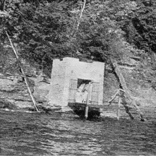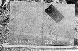 The flat, five ply, pitch-and-felt, Barrett Specification roof proved to be the largest and liveliest job of pitch lap making this writer ever did, particularly when the pitch, which was being raised toward 400° F, in an iron washtub over an open fire, flared up in a roar just as both feet became stuck in the hot, soft, just-mopped-on pitch tanglefoot. Has any reader ever found out why two things pick one time to happen? The castellated design is a perversion of one contributed by Russell Porter. The front porch shown is a temporary eyesore to be replaced by a proper stone stylobate or basal surround, to give proportion. Porter calls this cabin "Karnac," other refer to it as a mausoleum. Door hardware was forged from Swedish iron, to a tolerance of 10,000 wavelengths of the B line of sodium light. Inside are a corner fireplace, Shipmate range, built-in table, a bunk 7' overhead and a stone floor to fall out on. The "Fisherman Good Luck" invocation relates to the small-mouth black bass that lurk in the foreground in 20' of clear water and chuckle "they'll need it," as optimists troll past. This is a vacation hideout, and there's more than one way to hide out on a two-week vacation far from the madding crowd and the razor (Figure 7), while laying stone masonry. The preceding 53 lines and Figures 5, 6, and 7, give some indication of excessive mental strain under which Scribe Ingalls has been laboring the past 15 years. The purpose of this note is not only to disclaim all responsibility for the civil-life actions of our associate and especially for this month's department, but also to warn all "Telescope Nuts" of what may be expected from Scribe Ingalls 15 years from now, when he will have "retired" and be living in his own "mausoleum" (Figure 6.)-The Other Editors.