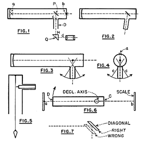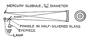 Collimating a Springfield telescope, with its extra reflection, is only a little harder than collimating a common telescope. We asked Russell Porter, who originated the Springfield, if this weren't true, and he replied that it's easier than falling off a log. From this, we sort of gather that there is a slight discrepancy somewhere. Was he pulling our leg? Cyril G. Wates, 7718 Jasper Ave., Edmonton, Alta., Canada, has shown interest in collimating problems that wreck less agile intellects, and so we recently showed him a wail received from a Springfield mounting maker who was on the verge of death from collimitis. In return he showed us the reply he had thoughtfully sent to the sufferer. It was so lucid that we asked him to dish it up as an article. Here it is: "I often find that it helps to visualize the problems involved in collimation if one thinks of the various optical axes as thin steel rods. If these 'rods' will turn freely in imaginary bearings rigidly attached to the mechanical parts of the telescope, collimation is bound to be perfect. "In Figure 1, D represents the declination axis, and a, b, c, are cross-threads. I assume that the main mirror has been lined up with a and b. Now if the diagonal P is inserted and adjusted so that cross-wire c lines up with a, when viewed along the center of the declination axis, the telescope can be rotated on this axis without throwing the cross-hairs out of line, because all the parts involved are solidly connected together. However, the moment prism H is put into the path of the rays, another factor is involved, because H is not connected to the rest of the optical parts; it stands still while everything else turns around. "Note that it does not make the slightest difference to the collimation whether the declination axis is at right angles to the tube or not, so long as the optical axis of the light cone coincides with the mechanical axis of the declination axis. It might be like Figure 2 without affecting the collimation adversely, since all the parts are united, and once having got the cone of rays truly centered in the declination axis, you may throw the rest of the parts, tube, mirror and diagonal, away, and forget them. This does not mean, of course, that the declination axis need not be at right angles; simply that its rectangularity has no bearing on the collimation. "Now, let's bring the prism H and eyepiece into the picture. These also are fastened together. Consider the point Q where the ray cd cuts the diagonal surface of the prism. If this point is exactly in the center of the declination axis, it makes no difference, as far as collimation is concerned, if the prism and eyepiece are all cockeyed. "The whole thing simmers down to this: the ray cd must be lined up exactly in the center of the declination axis, and after that condition is secured, all adjustments can be made on the prism H and eyepiece without in any way affecting the collimation of the main tube. "There is, however, a way in which the relationship between the declination axis and main tube affects the collimation. Picture the declination axis connected to the tube by a universal joint. Also picture the mechanical center of the declination axis as a thin rod protruding into the tube, and the optical axis of the tube as another thin rod. Obviously, these rods must intersect. Assume that they do intersect. Then the declination axis could be moved on its joint longitudinally without breaking the intersection (Figure 3). One rod slides along the other. "If, however, the declination axis is moved crosswise the intersection will break at once. (Figure 4). If the intersection is broken, it obviously will be impossible to reflect the central ray so that it follows the center of the declination axis, and I imagine that this is the commonest cause of trouble in collimating a Springfield. The remedy is to shim the tube in its cradle until the declination axis is square-on, but it is more difficult to design a method by which this squaring on may be accurately tested. "One way would be by means of a wooden rod, turned in the lathe to fit snugly inside the declination axis and having a tiny pin in the center. This could be combined with a plumb-bob hanging axially in the tube (Figure 5). A simpler way is the old one of marking the point a (Figure 4) with great exactness, and sighting at it by means of cross-wires in the declination axis. "Both these methods assume that the inside of the declination axis is concentric with the outside, which may not be the case; also they lack refinement. No pains should be spared to get this adjustment accurate, as everything else depends upon it. If it is not correct, one of two things will happen: either the central ray will be reflected parallel to, but not coincident with, the mechanical axis of the declination bearing, or the central ray will be cockeyed, like one of the lines c c (Figure 4). Either condition is clearly fatal to collimation. "The best method is probably a modification of one described in 'A.T.M.' for lining up the declination axis, that is, by sighting at fixed posts and reversing the tube. Assuming that this already has been done, new sighting blocks are provided as near to the ends of the tube as will permit the head to be inserted at either end. The set-up is shown diagrammatically in Figure 6. "In addition to the cross-wires, provide a disk of cardboard which can be attached to either end of the tube, with a 1/16" hole accurately punched to coincide with the intersection of the cross-wires. (I should make the disk first, and attach the cross-wires to intersect in the hole). Putting the disk at C, sight toward a, and put a dot on the block where the wires fall. Without moving the tube, put the disk at D and sight toward b, which has a scale fastened to it. Note the reading en the scale. "Without removing the disk, reverse the tube and line up the cross-wires on the dot, at a. Transfer the disk to the other end, and sigh